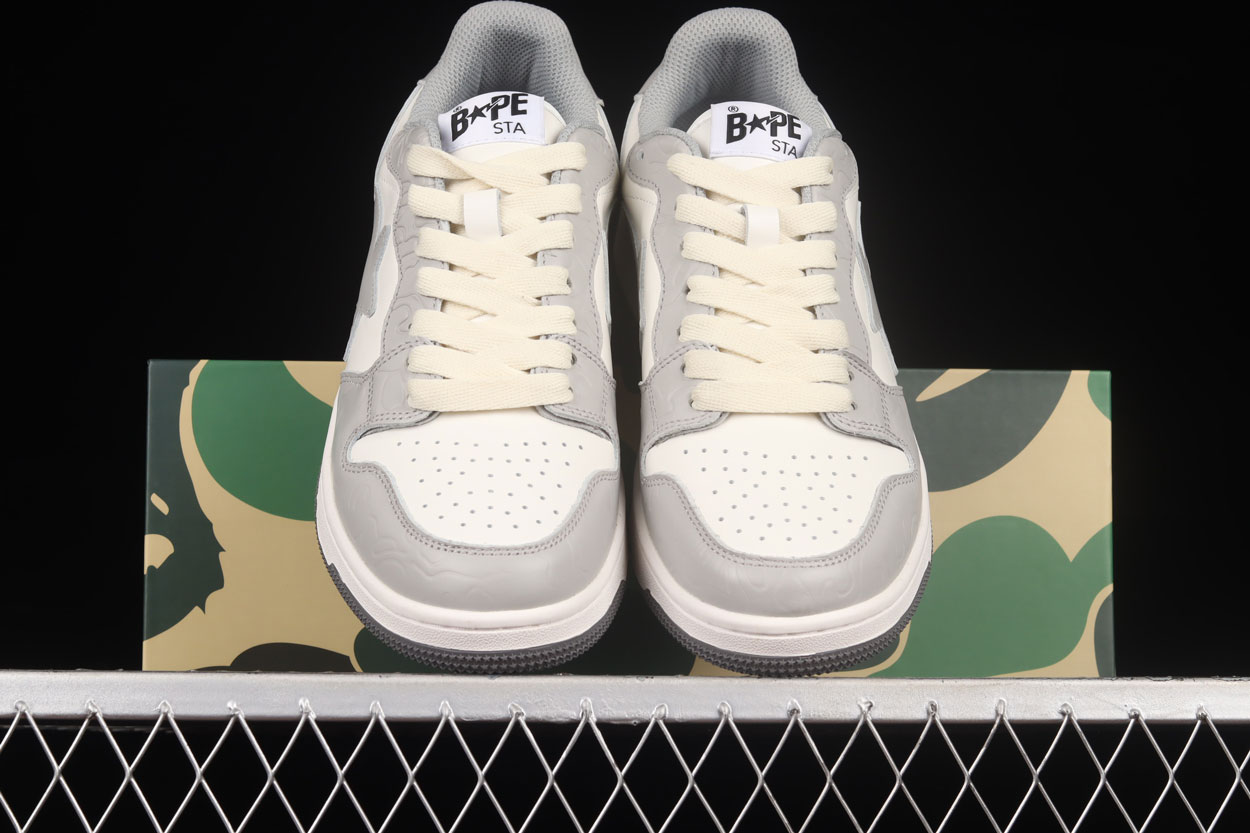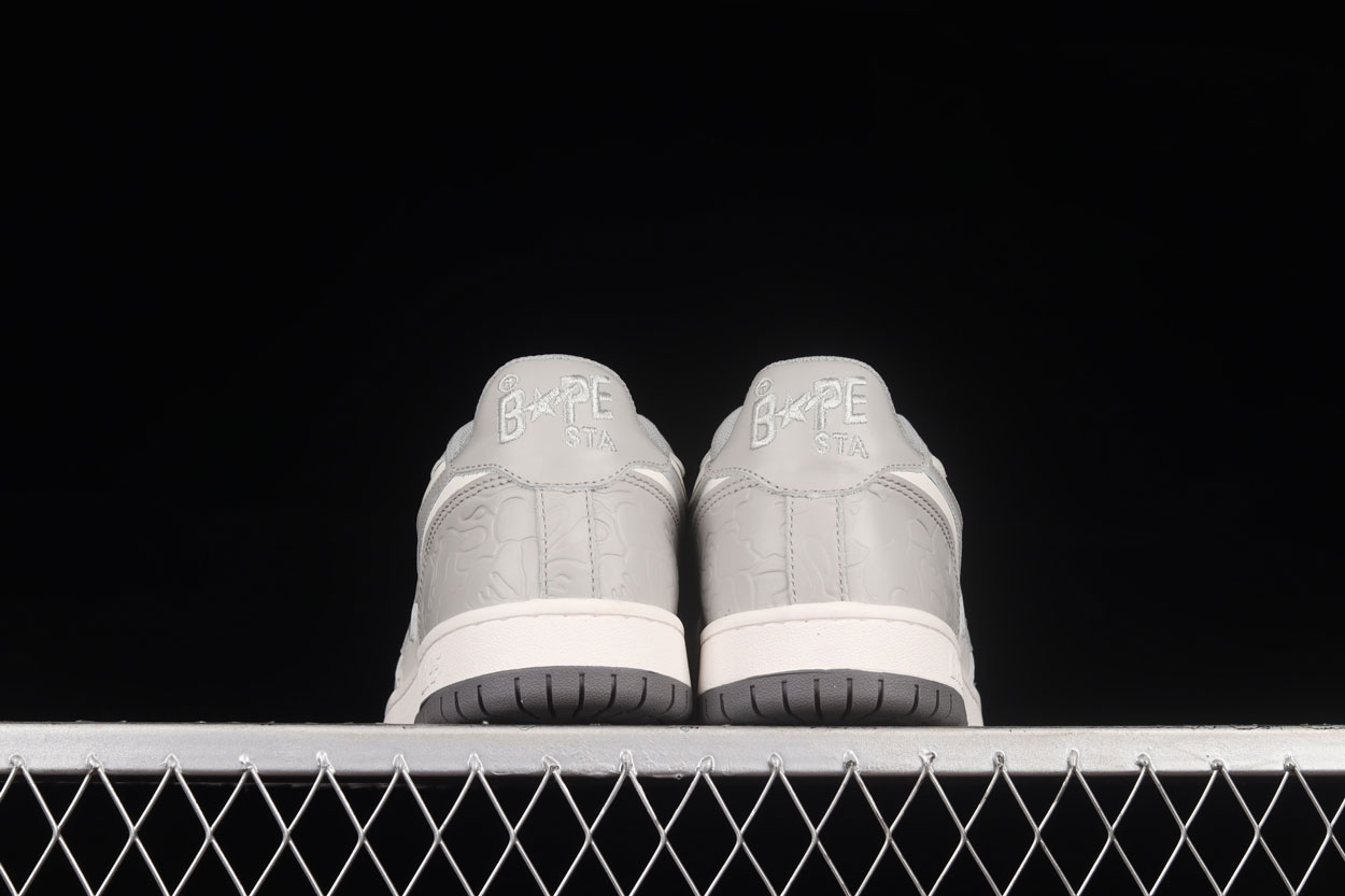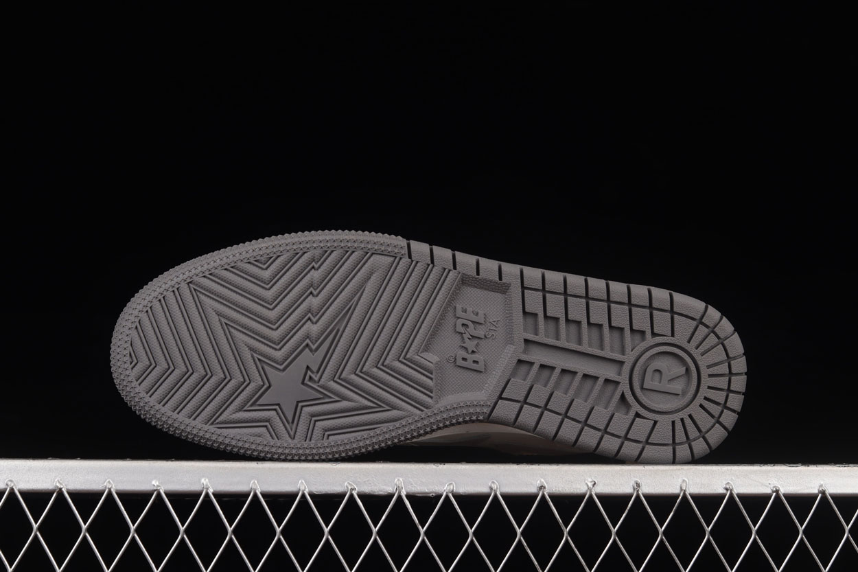 First dropped in 2000, BAPE STA became an instant icon as the signature footwear of A BATHING APE. The star-shaped “STA” logo sweeping along the sides and the vibrant collection of colourways and designs has been a defining feature of Japanese hip-hop streetwear over the last 20 years. The shoes are crafted with coloured leather, shiny metallic elements, textured foam rubber soles, presenting the new BAPE COURT STA’s colorways to suit your personal flavour of outdoor adventure. These Sk8 Stas feature a grey star logo, surround by cream paneling over a grey base. Brought together by a dark grey sole.
