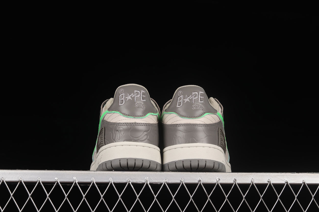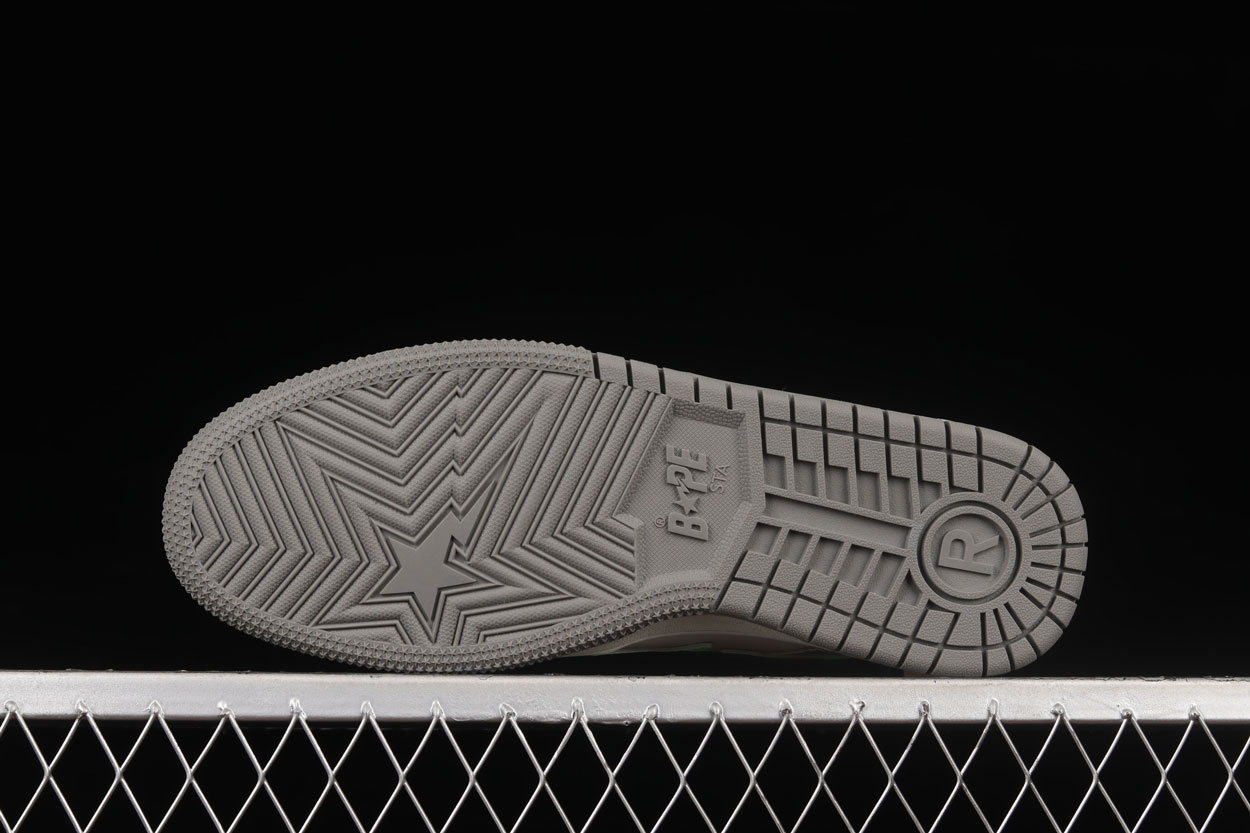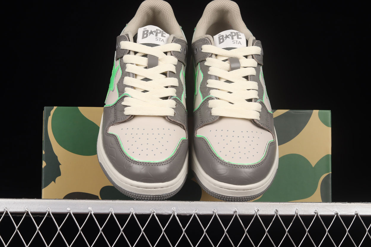 First dropped in 2000, BAPE STA became an instant icon as the signature footwear of A BATHING APE. The star-shaped “STA” logo sweeping along the sides and the vibrant collection of colourways and designs has been a defining feature of Japanese hip-hop streetwear over the last 20 years. The shoes are crafted with coloured leather, shiny metallic elements, textured foam rubber soles, presenting the new BAPE SK8 STA colourways to suit your personal flavour of outdoor adventure. These Sk8 Stas feature a neon green star logo, surround by grey paneling over a cream base. Brought together by a grey sole.