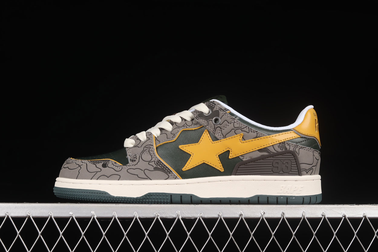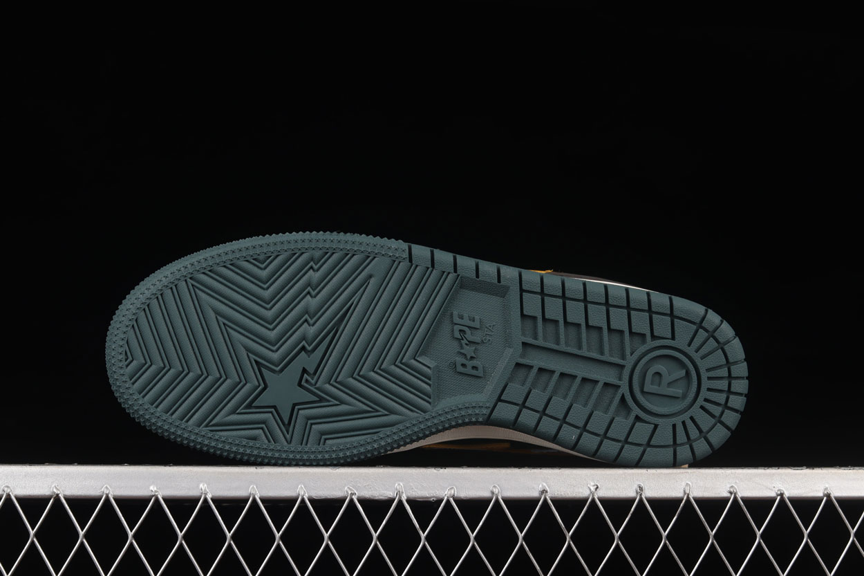 First dropped in 2000, BAPE STA became an instant icon as the signature footwear of A BATHING APE. The star-shaped “STA” logo sweeping along the sides and the vibrant collection of colourways and designs has been a defining feature of Japanese hip-hop streetwear over the last 20 years. The shoes are crafted with coloured leather, shiny metallic elements, textured foam rubber soles, presenting the new BAPE SK8 STA colourways to suit your personal flavour of outdoor adventure. These Sk8 Stas feature a yellow star logo, surround by grey paneling over a green base. Brought together by a green sole.