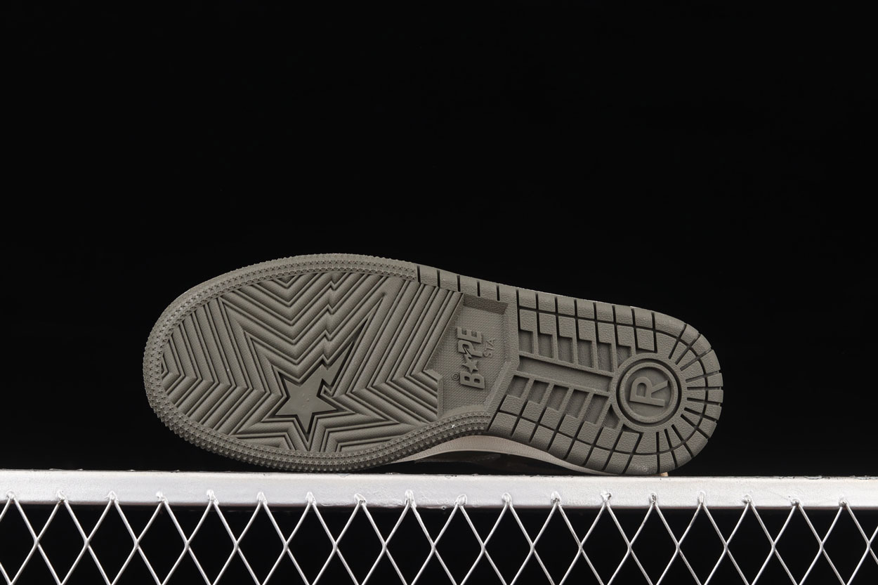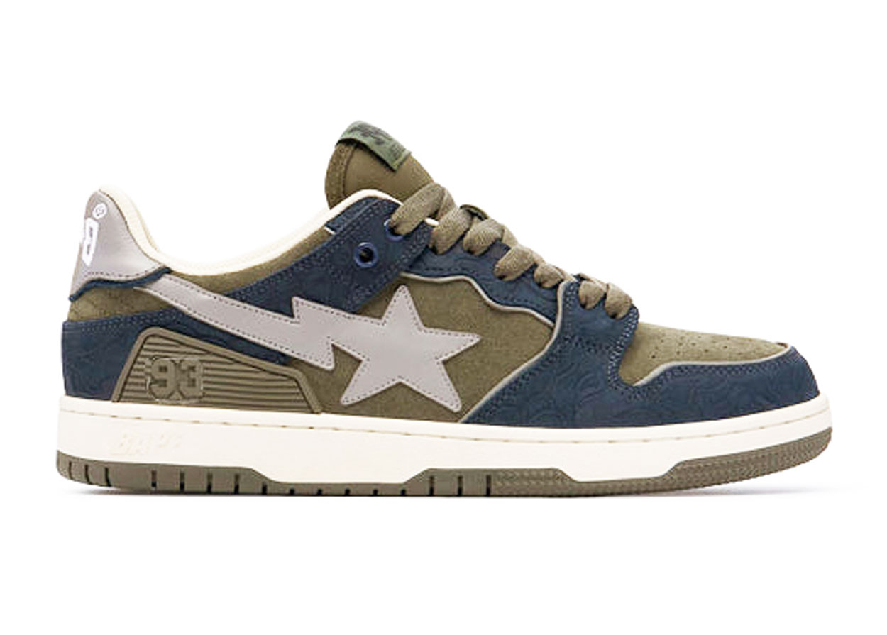 First dropped in 2000, BAPE STA became an instant icon as the signature footwear of A BATHING APE. The star-shaped “STA” logo sweeping along the sides and the vibrant collection of colourways and designs has been a defining feature of Japanese hip-hop streetwear over the last 20 years. The shoes are crafted with coloured leather, shiny metallic elements, textured foam rubber soles, presenting the new BAPE SK8 STA colourways to suit your personal flavour of outdoor adventure. These Sk8 Stas feature a grey star logo, surround by navy paneling over a green base. Brought together by a white green sole.