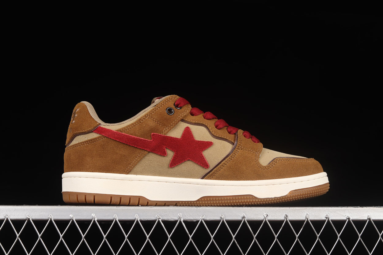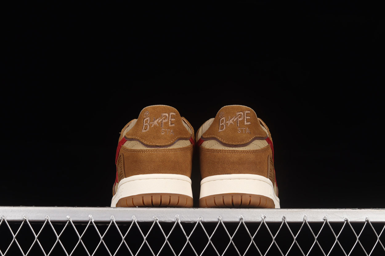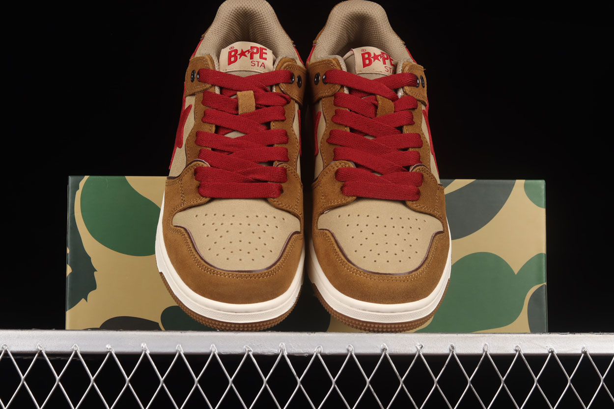 First dropped in 2000, BAPE STA became an instant icon as the signature footwear of A BATHING APE. The star-shaped “STA” logo sweeping along the sides and the vibrant collection of colourways and designs has been a defining feature of Japanese hip-hop streetwear over the last 20 years. The shoes are crafted with coloured leather, shiny metallic elements, textured foam rubber soles, presenting the new BAPE SK8 STA colorways to suit your personal flavour of outdoor adventure. These Sk8 Stas feature a red star logo, surround by beige paneling over a wheat brown base. Brought together by a white and beige sole.