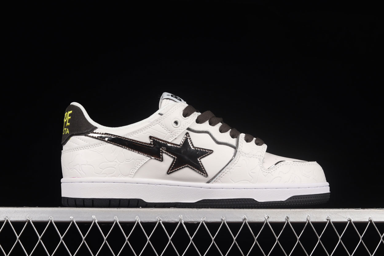 First dropped in 2000, BAPE STA became an instant icon as the signature footwear of A BATHING APE. The star-shaped “STA” logo sweeping along the sides and the vibrant collection of colourways and designs has been a defining feature of Japanese hip-hop streetwear over the last 20 years. The shoes are crafted with coloured leather, shiny metallic elements, textured foam rubber soles, presenting the new BAPE SK8 STA colourways to suit your personal flavour of outdoor adventure. These Sk8 Stas feature a black silver star logo, surround by white paneling. Brought together by a black sole.