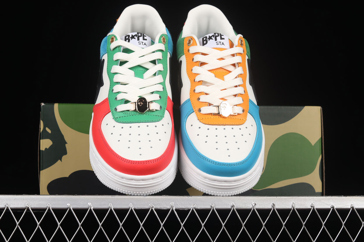 First dropped in 2000, BAPE STA became an instant icon as the signature footwear of A BATHING APE. The star-shaped “STA” logo sweeping along the sides and the vibrant collection of colourways and designs has been a defining feature of Japanese hip-hop streetwear over the last 20 years. The shoes are crafted with coloured leather, shiny elements, textured foam rubber soles, in different colourways to suit your personal flavour of outdoor adventure. These Bape Stas feature a black star logo, surrounded by multi coloured paneling over a white base. Brought together by a white sole.