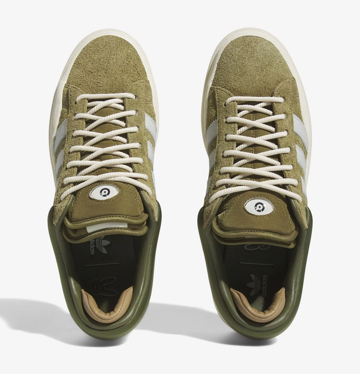 The Bad Bunny adidas Campus Light was released in a Wild Moss colorway, featuring an all Wild Moss Green upper, tongue, and sockliner, while cream colored rope laces sit on top of the stacked double tongue which houses Bad Bunny branding on top. Bad Bunny and adidas added a brown padded cushion around the sockliner of the shoe for added support.