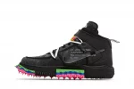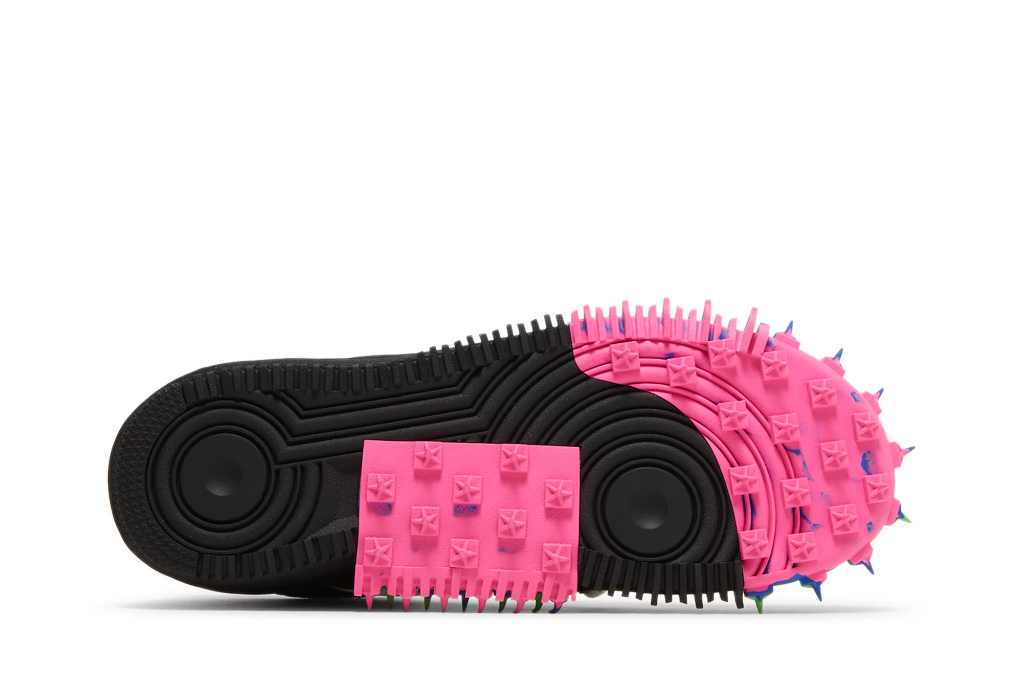 The Nike Air Force 1 Mid Off-White honors the 40th Anniversary of the Nike Air Force 1 by refreshing the classic design with Abloh’s signature avante-garde style. It arrives with a black, wood grain-textured lightweight mesh upper with ripstop collar straps and clear TPU Swooshes. From there, a warped midsole with multi-colored sections of a track-inspired spiked outsole reference past Nike Off-White designs like the Nike Waffle Racer and Air Zoom Tempo Next%.
