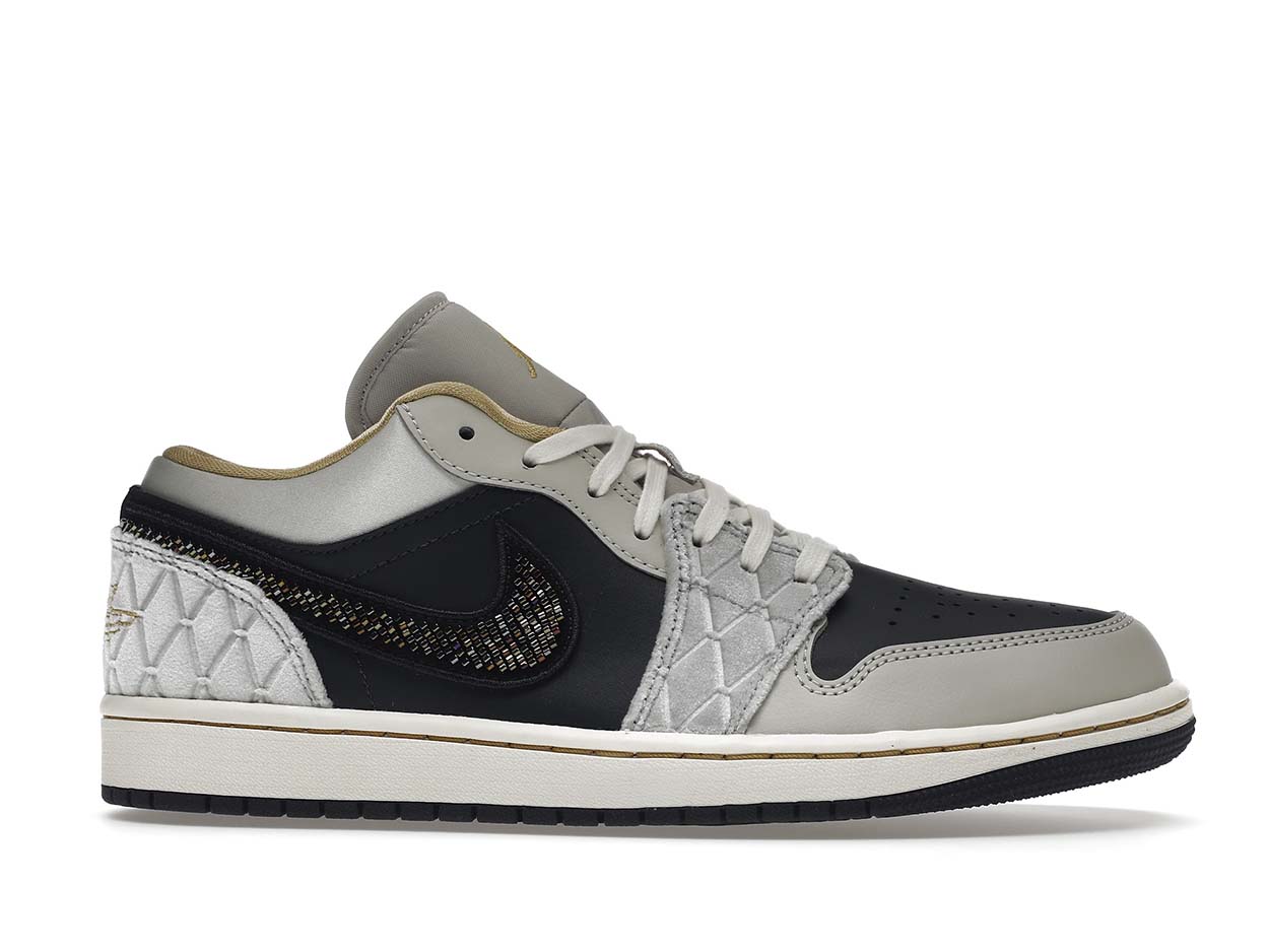 Air Jordan 1 Low Beaded Swoosh has paneling made of leather, satin, and suede with diamond patterns. Air Jordan 1 Low Beaded Swoosh is available in a black and gray color pattern with subtle undertones of gold for a luxurious touch. The low-top is further distinguished by an iridescent beaded Swoosh, and a sail midsole completes the design, with gold stitching and a black rubber outsole.