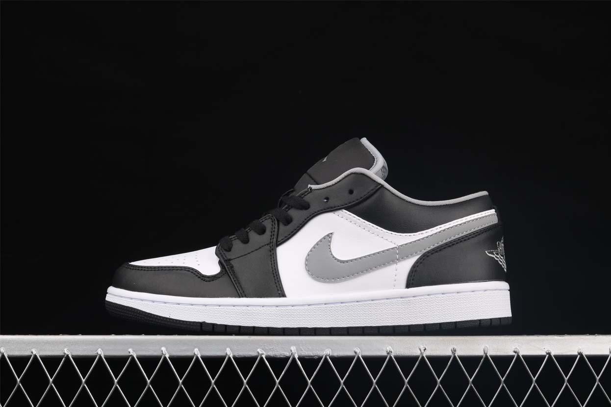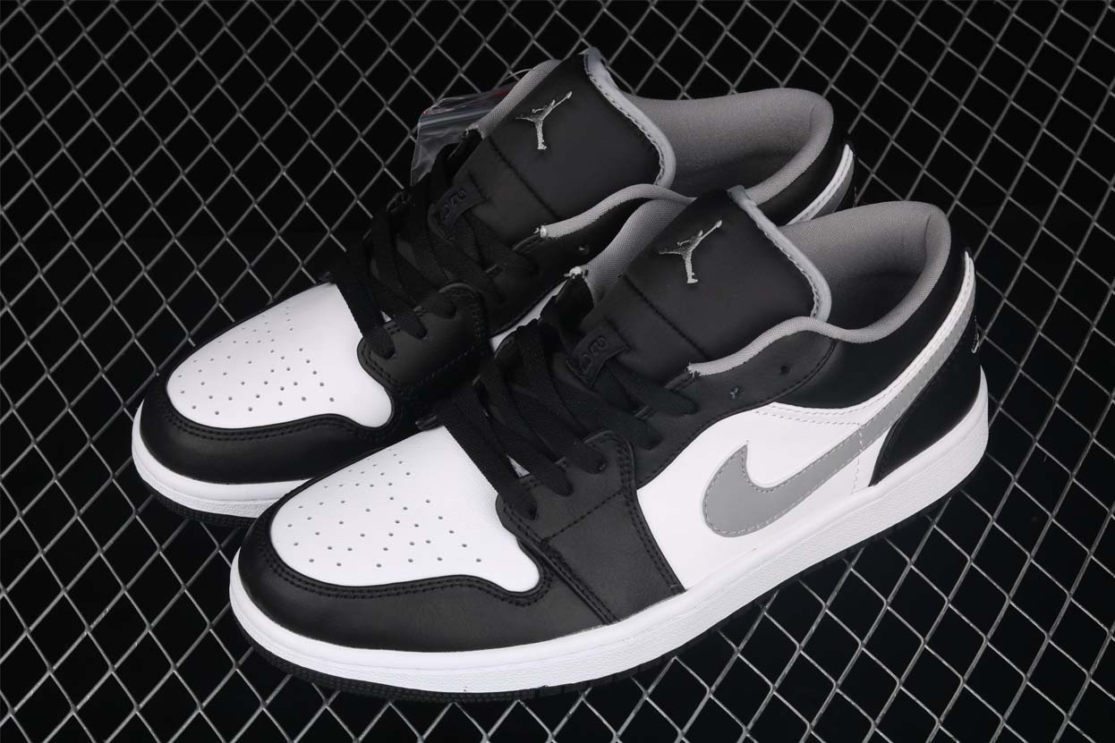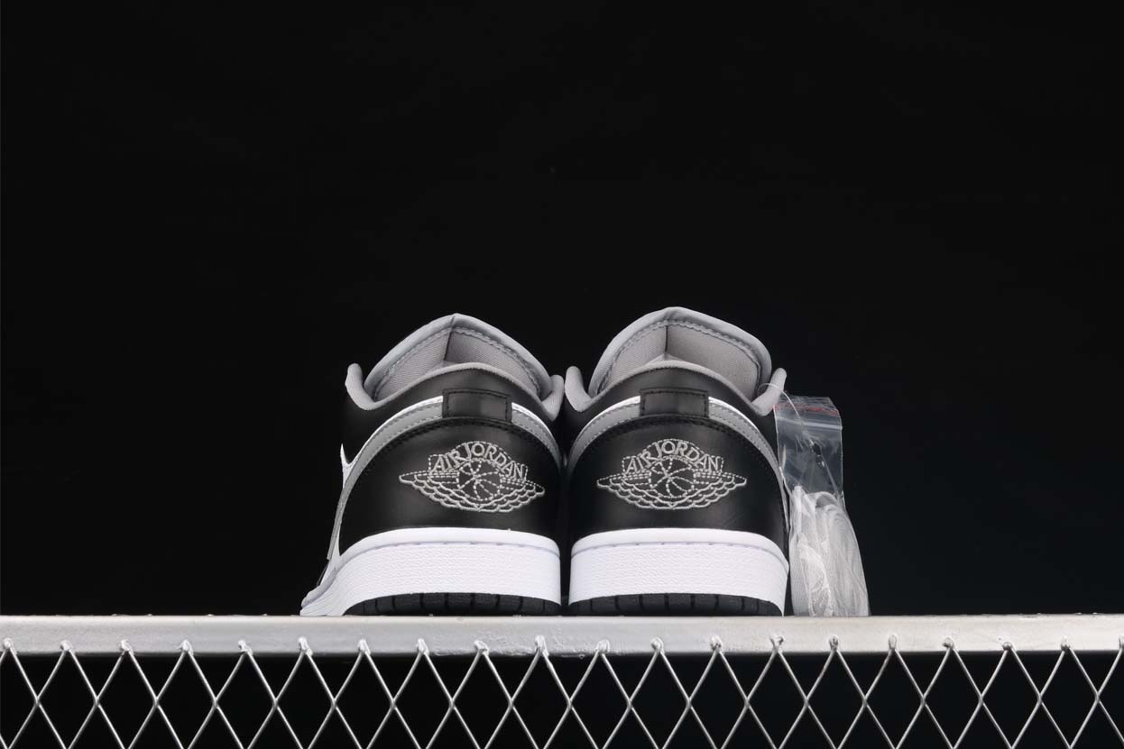 The Jordan 1 Low White Black Grey features a white leather upper with black overlays and grey Swooshes. From there, Jordan Wings and Jumpman logo embroideries on the heel and tongue complete the design.