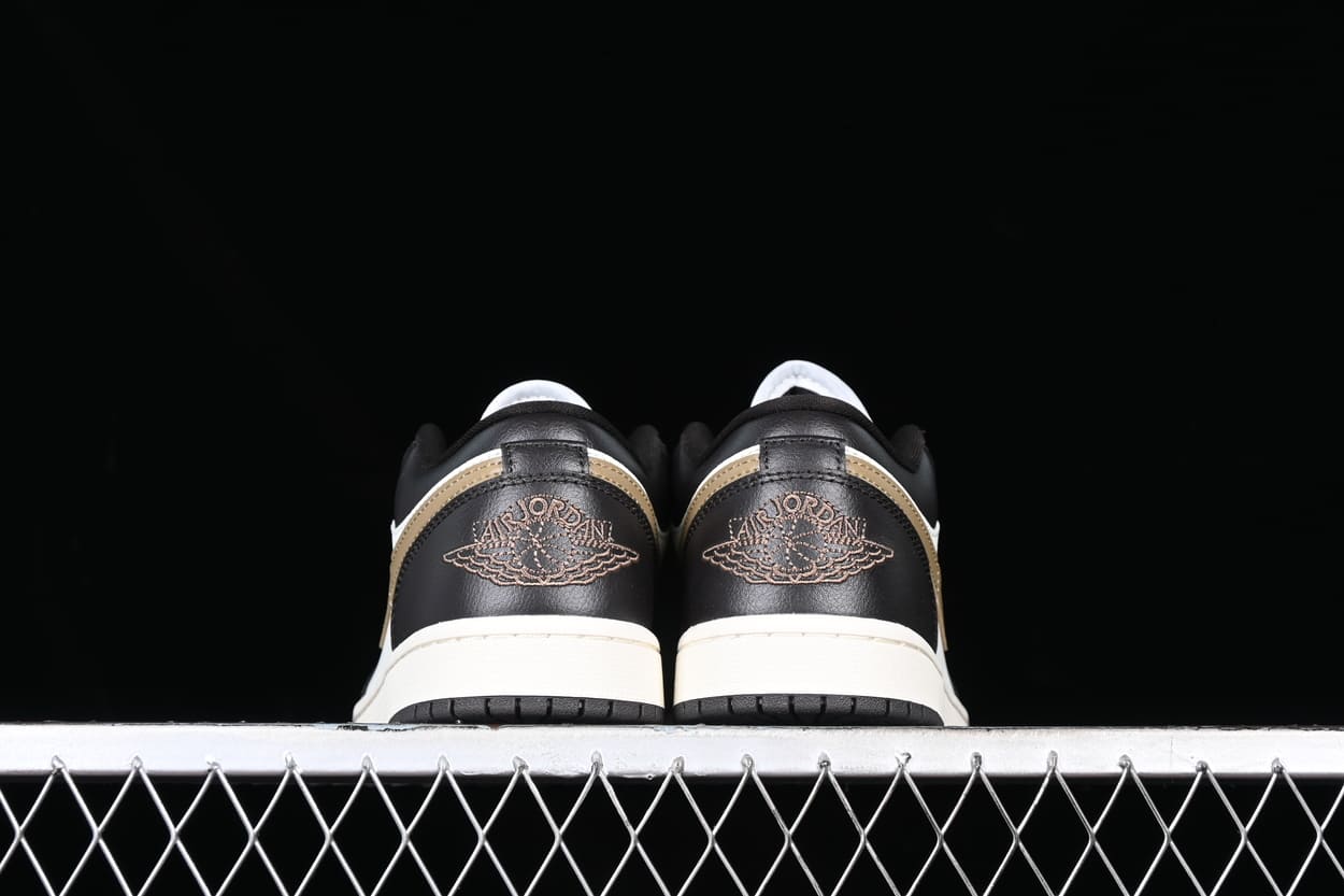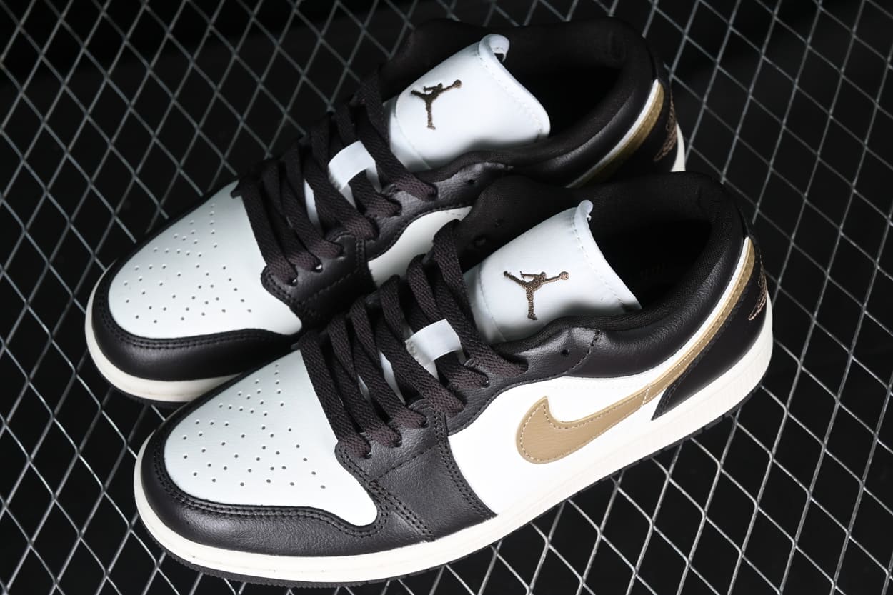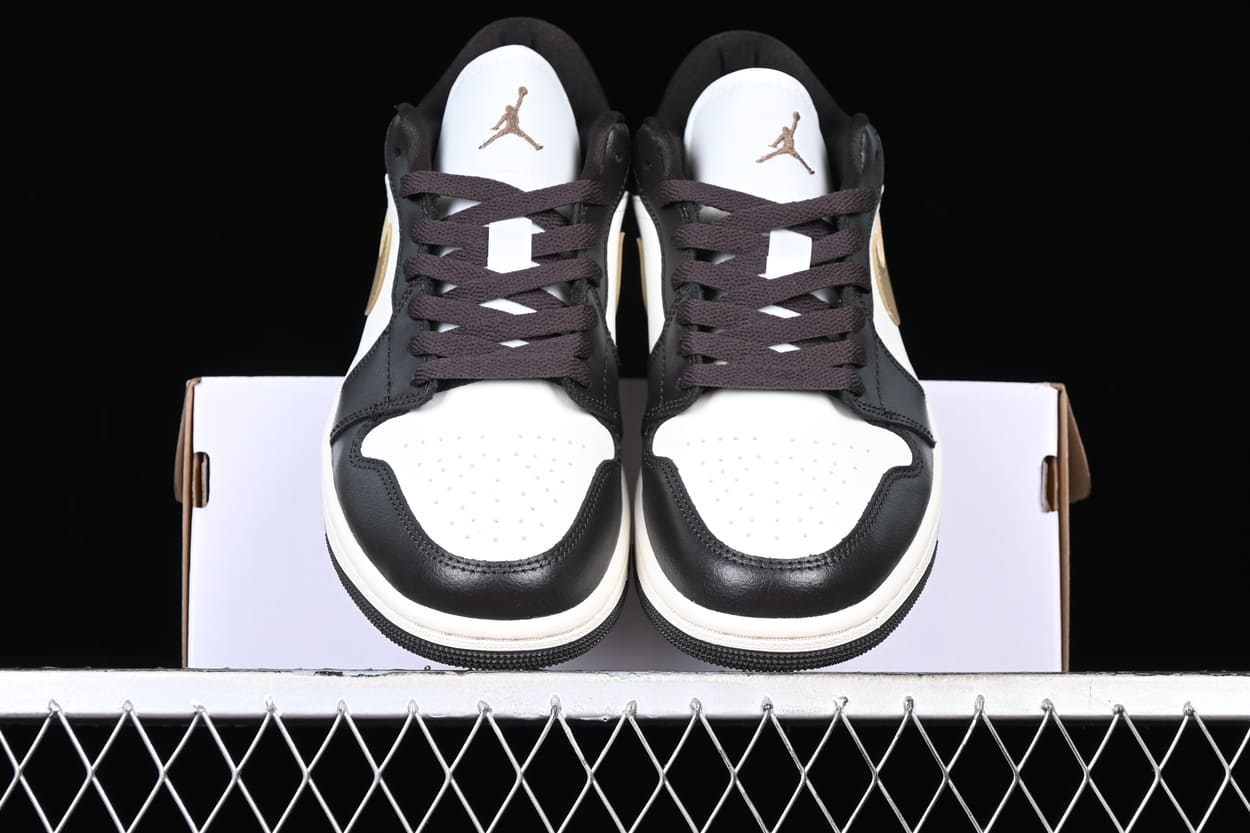 This sneaker features a white leather base with black overlays lining the perforated toebox, the laces, and the heel. The Nike Swoosh appears on the midsole of this Low Jordan 1 in Shadow Brown, and the Air Jordan logo is stitched on the heel in the same color. The Jumpman logo also appears on the tongue in Shadow Brown.