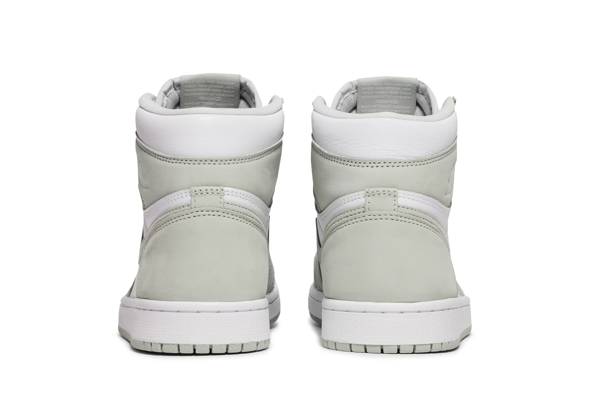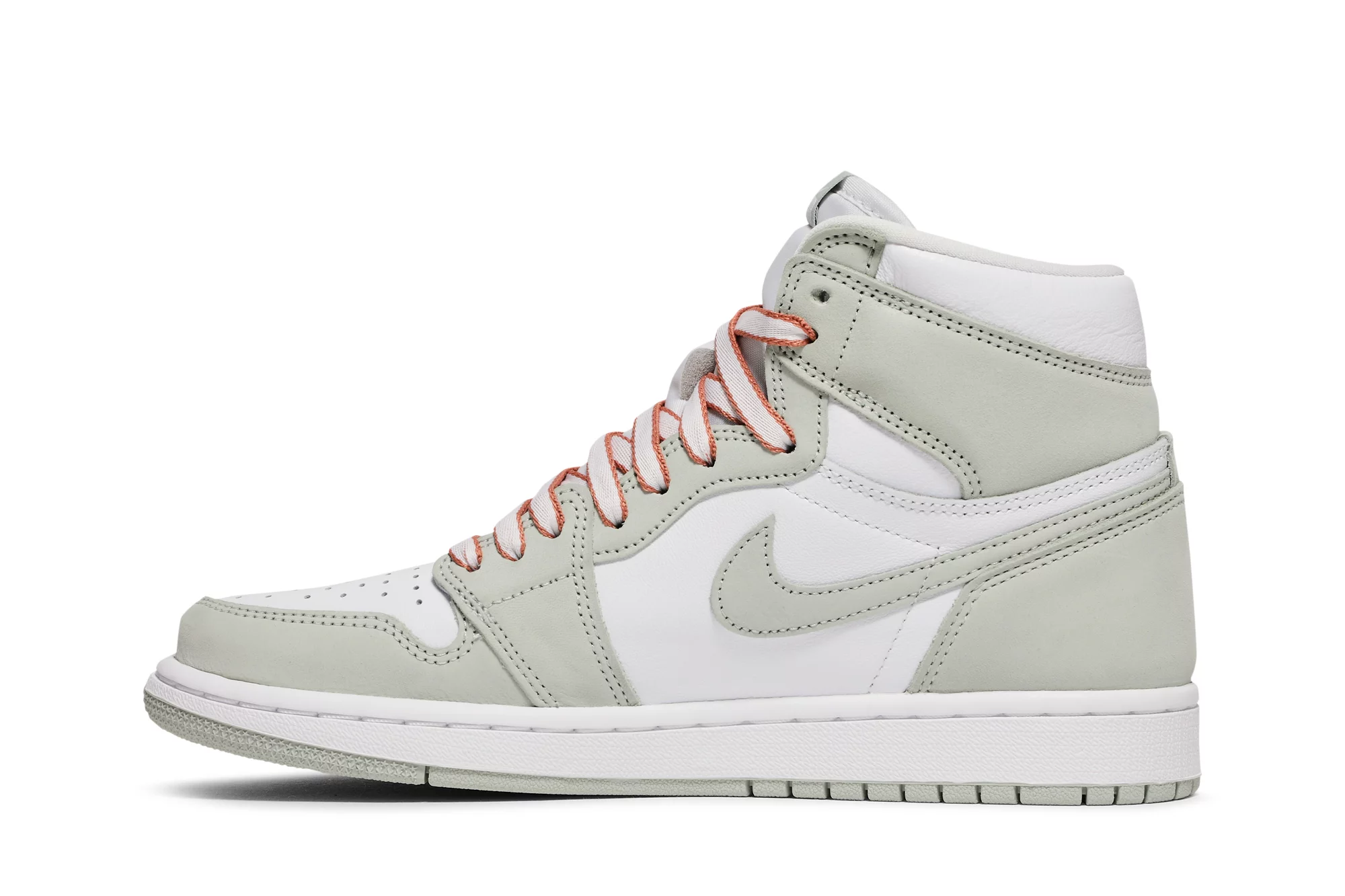 The women’s Air Jordan 1 High Seafoam (W) arrives in a smooth white leather construction with Seafoam Durabuck overlays and Swooshes. On the laces, crisp bronze trimming stands out against the design’s subtle coloration. The women’s Air Jordan 1 High Seafoam (W) released in August of 2021 and retailed for $170.