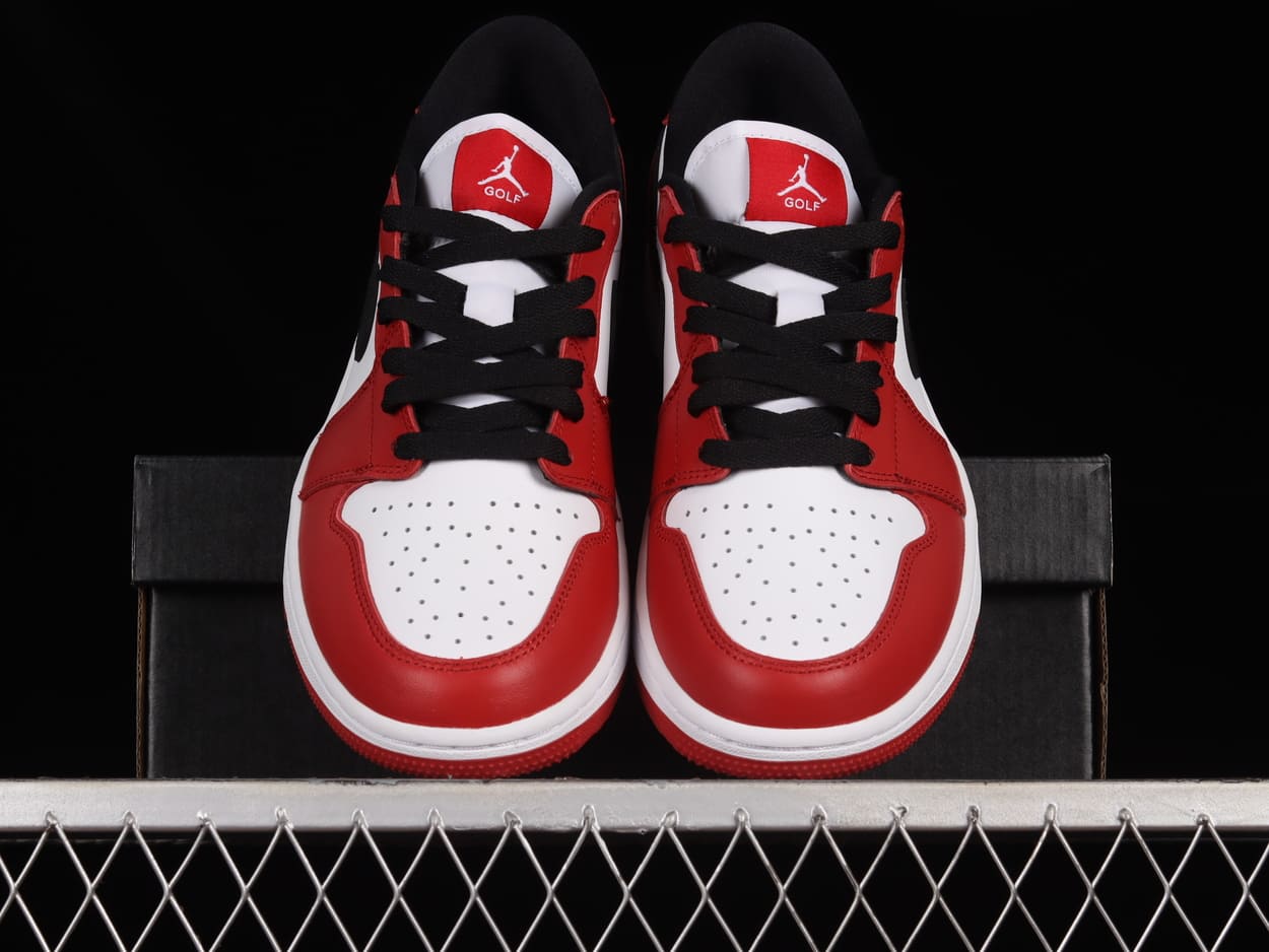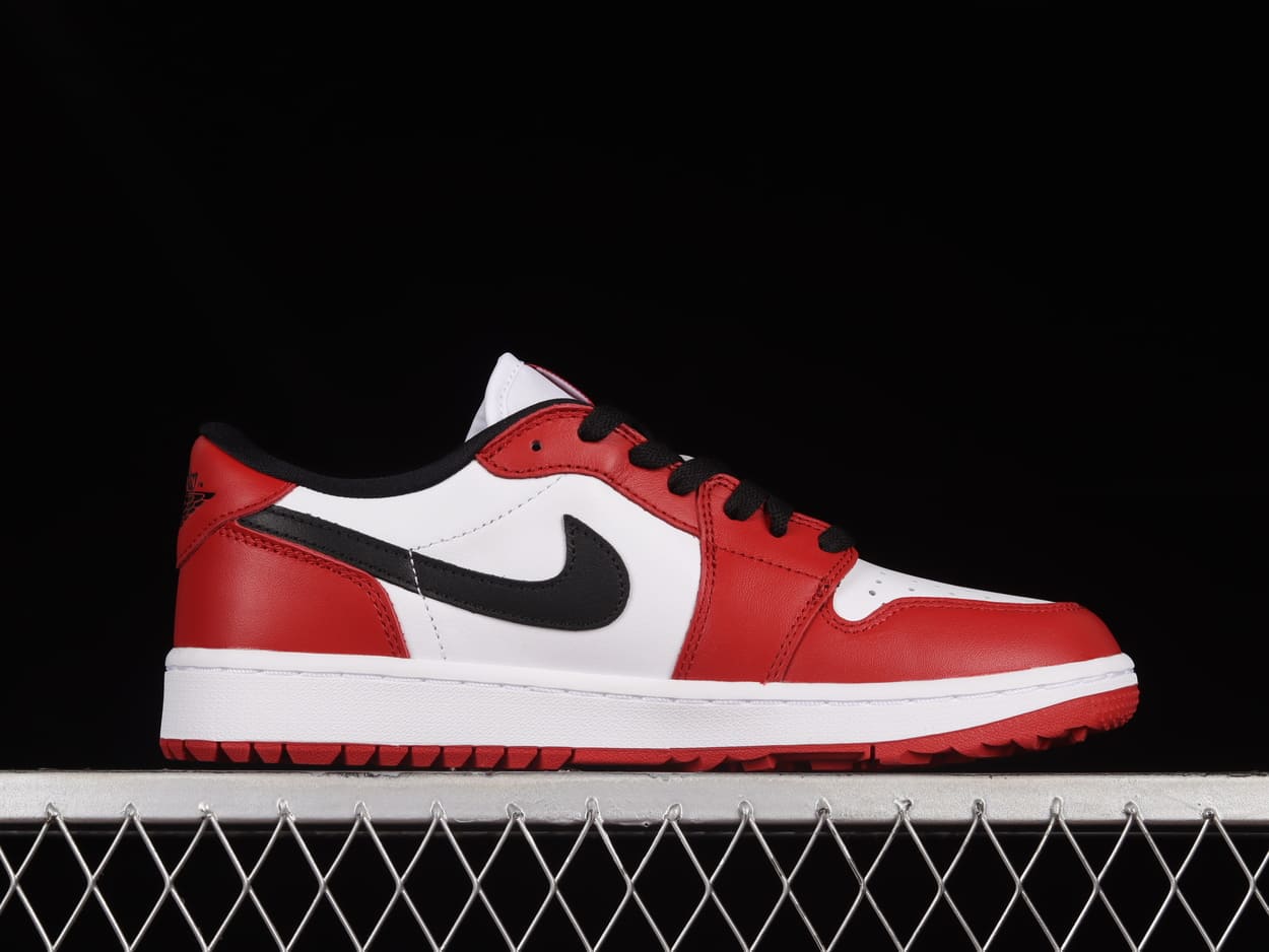 Similar to the Jordan 1 High Chicago Gold Cleat that was released in 2017, the Jordan 1 Low Golf Chicago gears the iconic colorway for the golf course. It features a smooth white leather upper with red overlays and black Swooshes. A black debossed Wings logo at the heel pays tribute to the first Air Jordan logo ever created. At the base, a red grooved outsole adds traction and support for long days on the green.