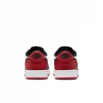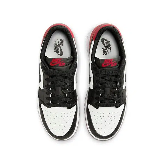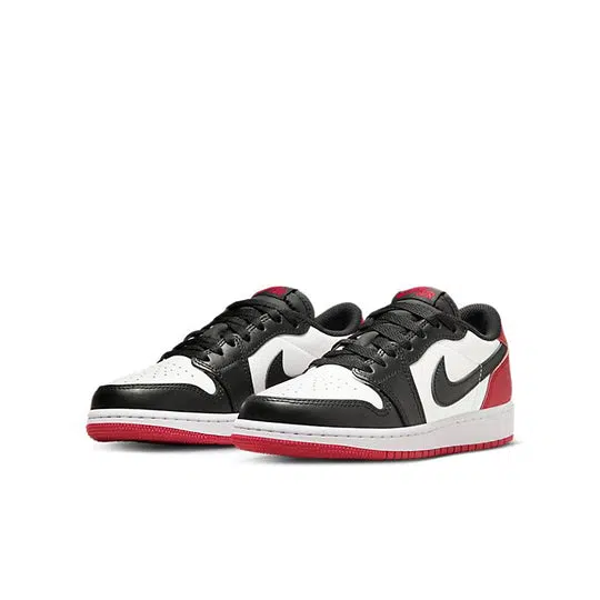 The upper of the Jordan 1 Retro Low showcases a striking blend of premium black and white leathers, accented by a vibrant red heel counter. Classic elements, such as the iconic Swoosh and the timeless ‘Wings’ logo, are in black, tying the whole look together. All this sits atop a clean, white midsole, proving that simplicity can still make a statement.