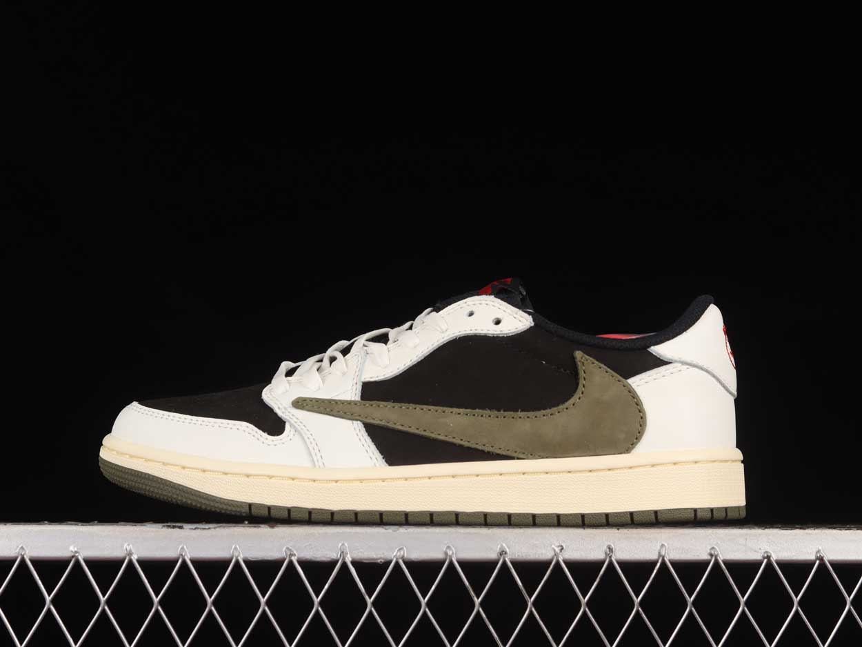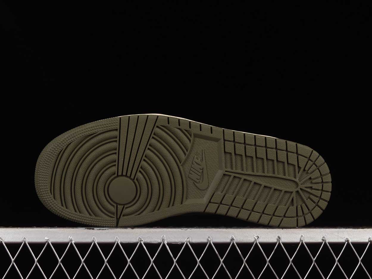 The Air Jordan 1 Low OG SP Travis Scott Olive is constructed with white leather and black nubuck uppers. Travis continued to use his signautre reverse style Nike Swoosh, in an olive green colorway. The limited edition sneakers have an aged midsole that sits on top of an olive green outsole.