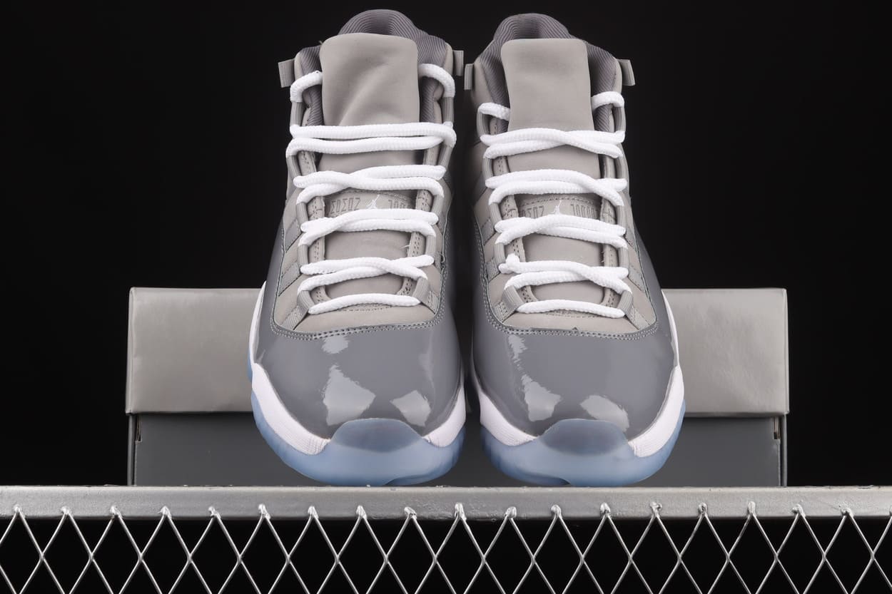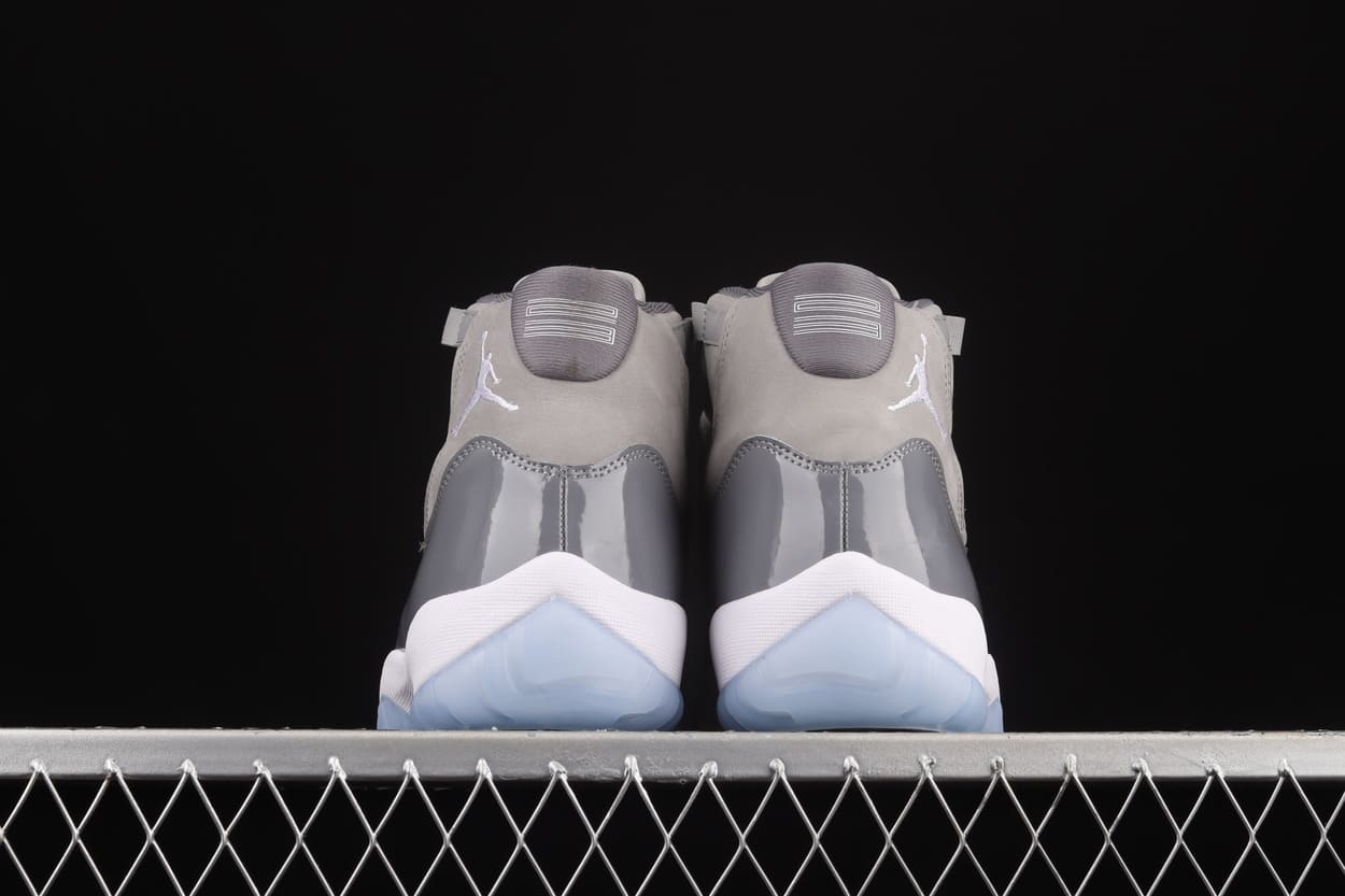 The Air Jordan 11 Cool Grey (2021) features a Cool Grey Durabuck upper with patent leather overlays and a signature Jumpman embroidery on the collar. From there, a white midsole and an icy blue translucent outsole complete the design.