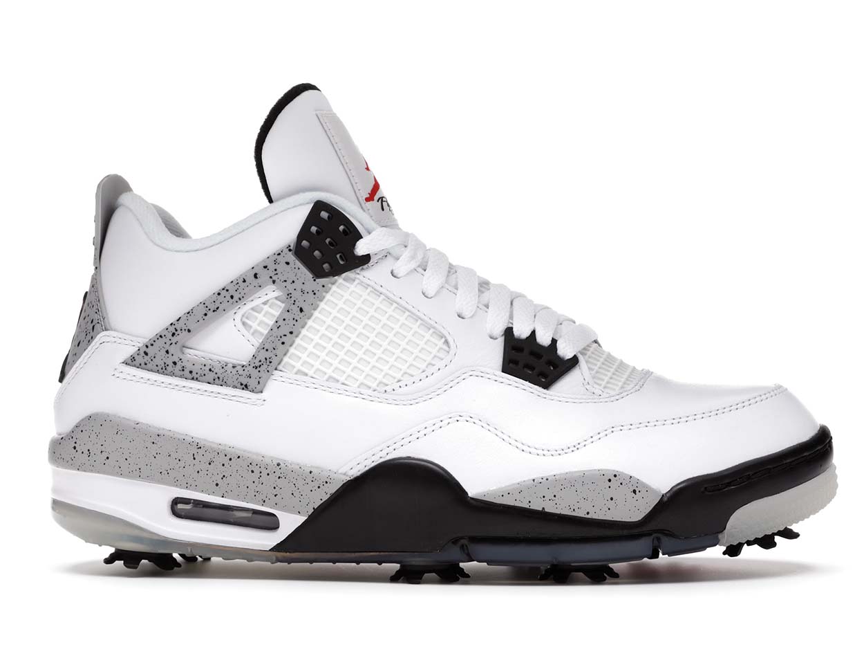 The Air Jordan 4 Retro Golf White Cement model can be found in the four main hues that tone white, black, fire red, and tech grey.