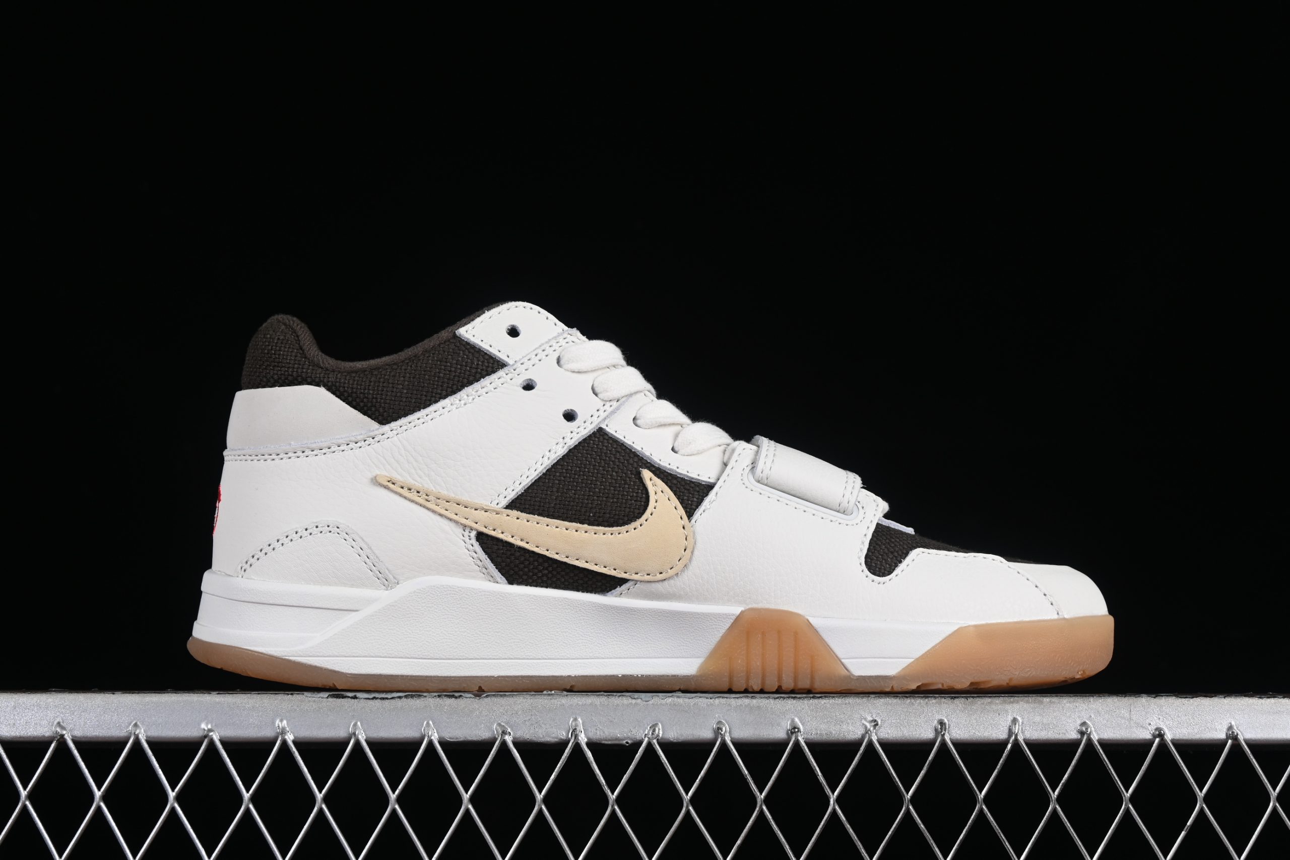 The upper features a soft off-white canvas base paired with leather overlays in creamy sail tones, creating a clean yet rugged aesthetic. A midfoot strap crosses over the laces, offering an adjustable lockdown fit that’s ideal for dynamic movement, while subtle suede paneling and a tonal Cactus Jack logo add layers of texture and attitude.