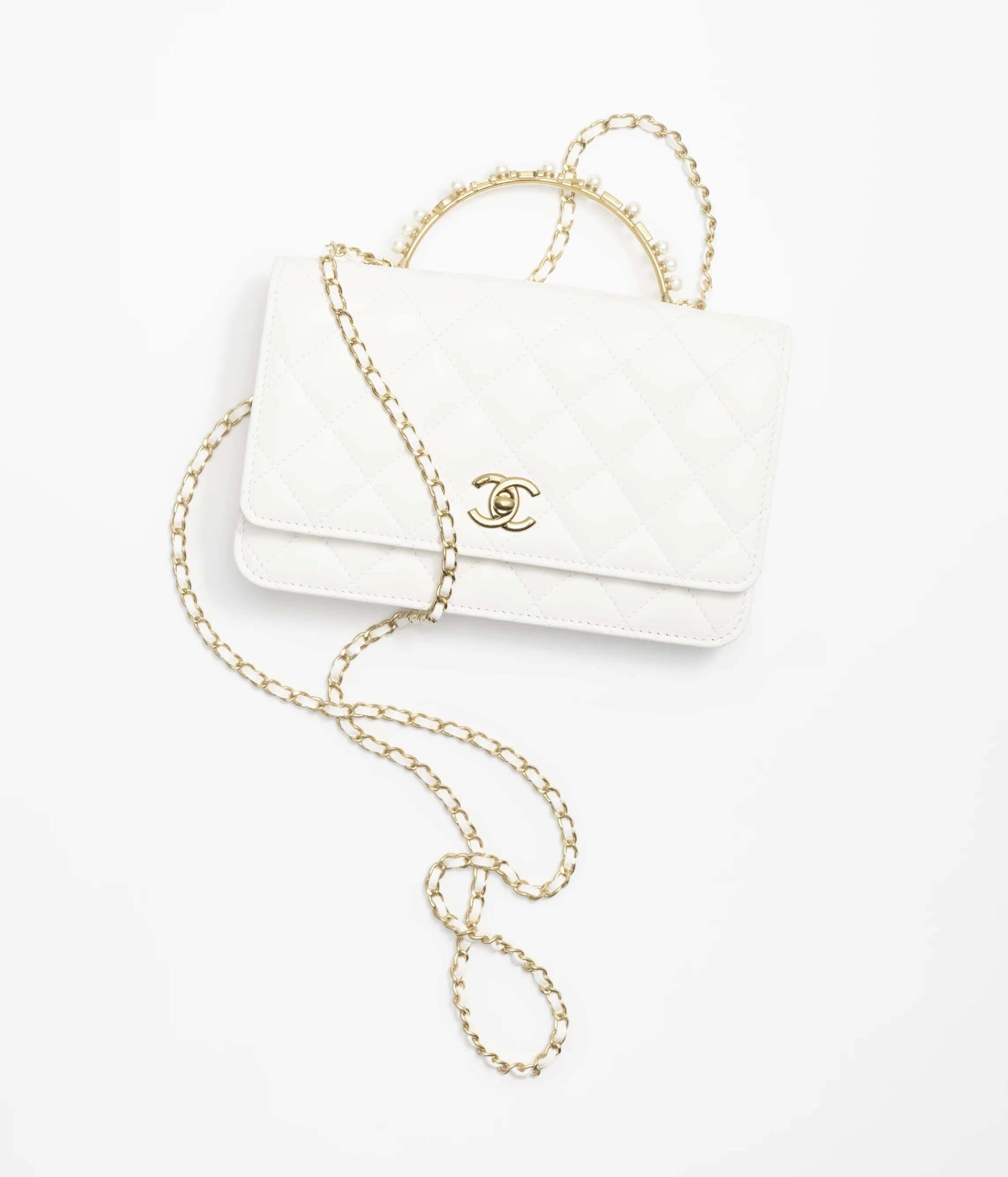Wallets on Chain of the Fall-Winter 2023/24 Pre-Collection collection: Wallet on Chain, lambskin, imitation pearls, strass & gold-tone metal, white on the CN official website.