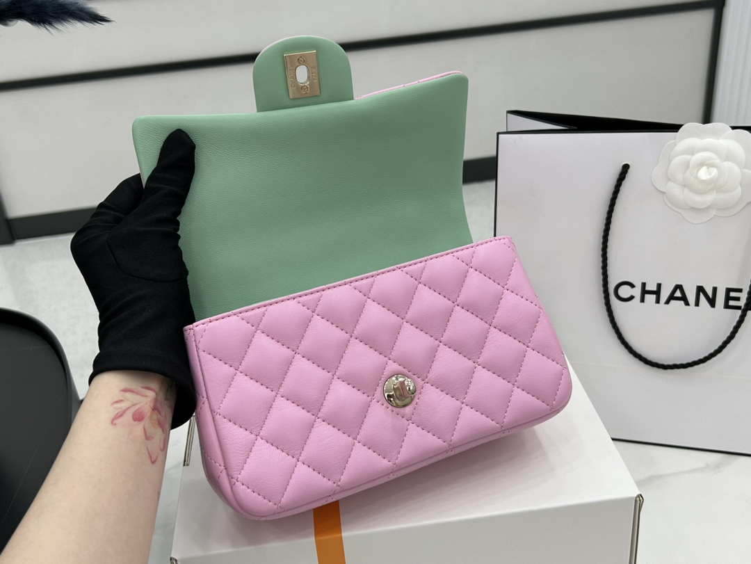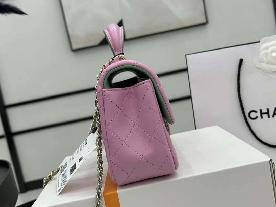 CN AS2431 Mini flap Pink with Green Lambskin bag with top handle Gold