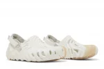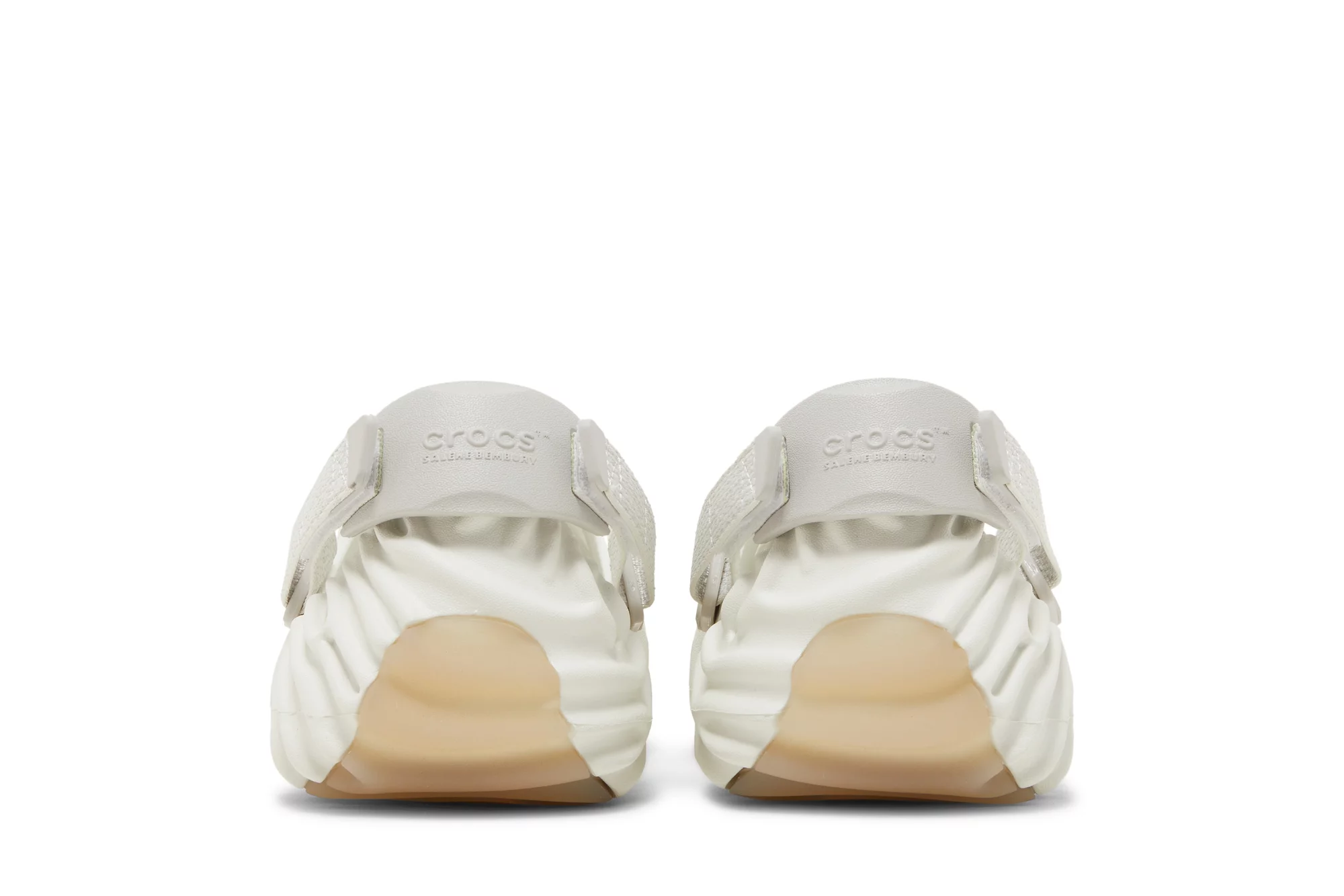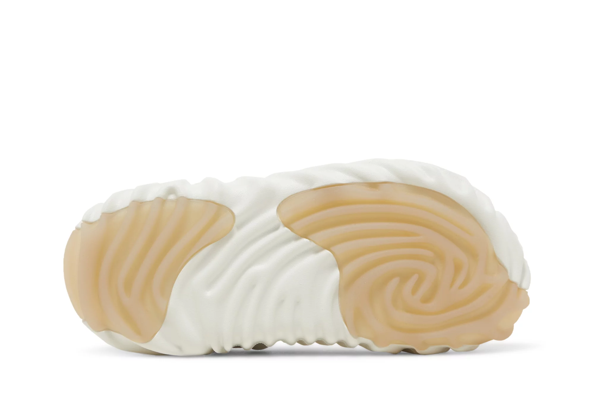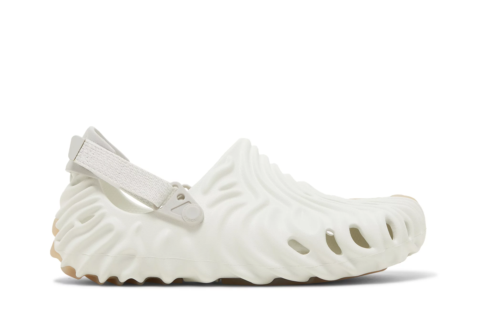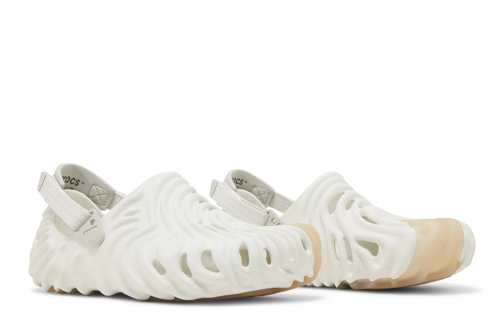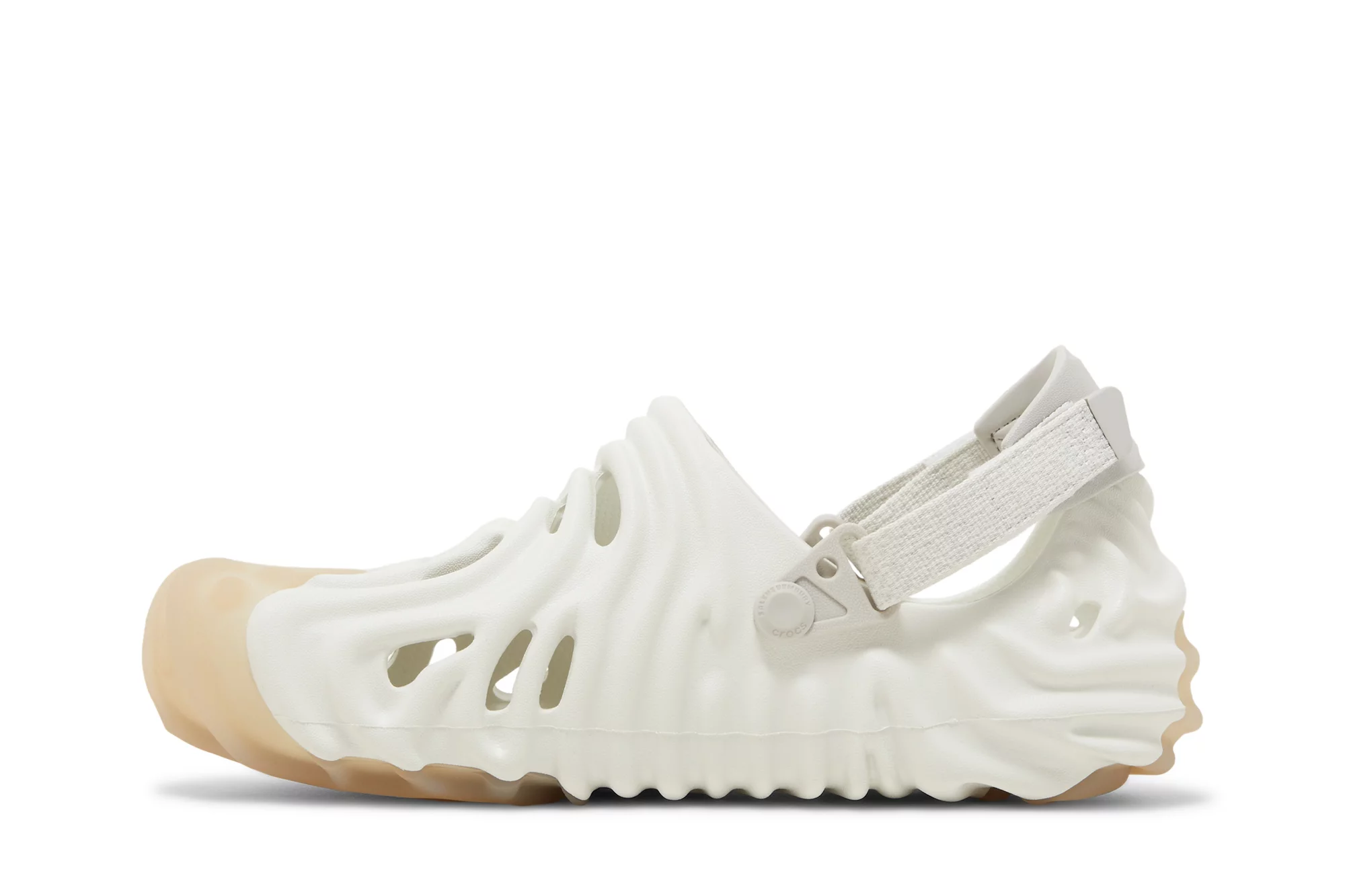 The Crocs Pollex Clog Salehe Bembury Stratus boasts an off white, exo-skeletal look with dramatic, fingerprint-like concave ridges throughout its foam construction. While there aren’t as many ventilation holes in this design compared to traditional Crocs Clogs, the remaining holes are located on high-heat areas of the foot for increased breathability. A removable canvas strap at the ankle provides wearers with an option for a more-secure fit.