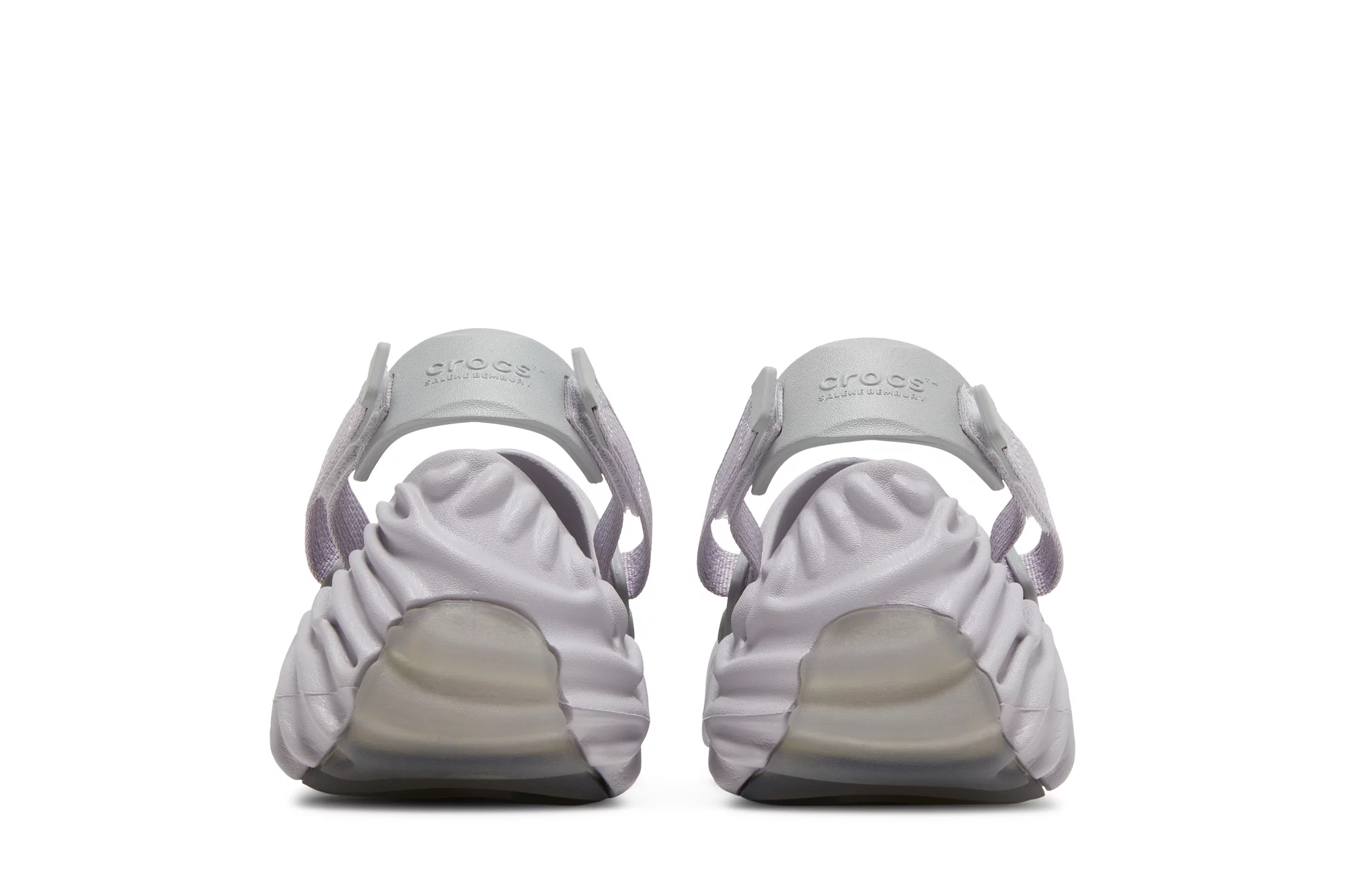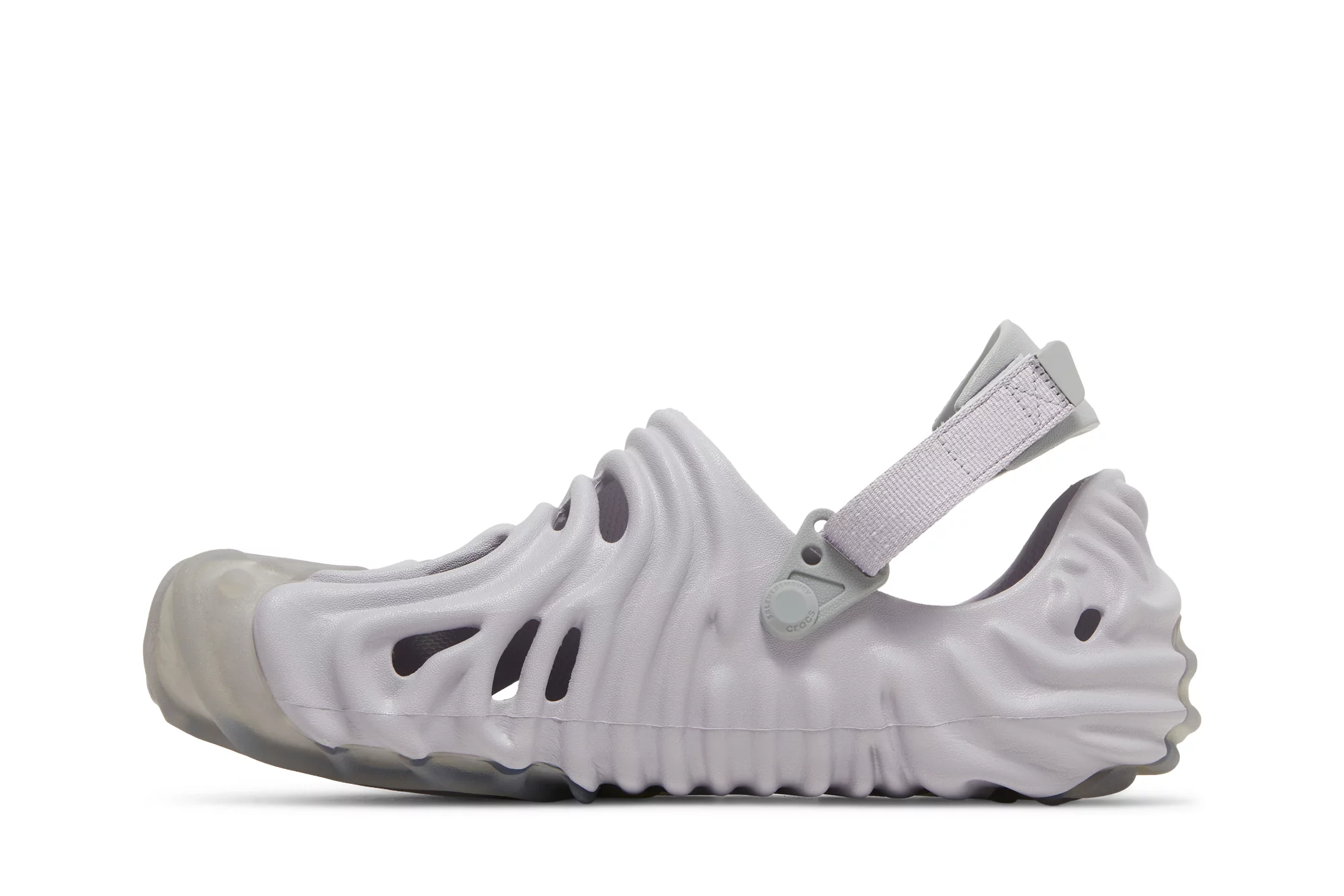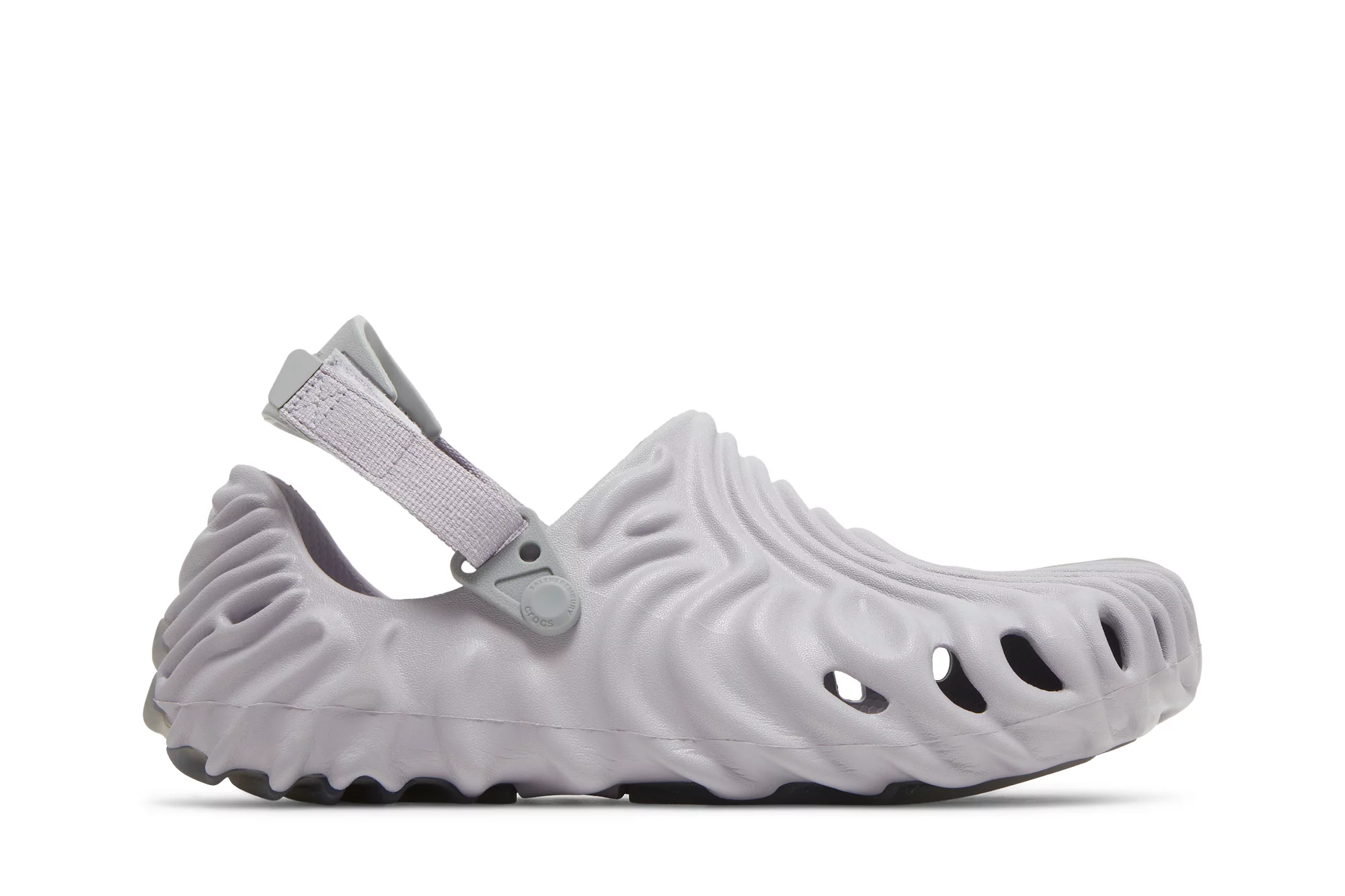 The Crocs Pollex Clog Salehe Bembury Urchin arrives in a light purple, exo-skeletal look with dramatic, fingerprint-like concave ridges throughout its foam construction. While there aren’t as many ventilation holes in this design compared to traditional Crocs Clogs, the remaining holes are located on high-heat areas of the foot for increased breathability. A removable canvas strap at the ankle provides wearers with an option for a more-secure fit.