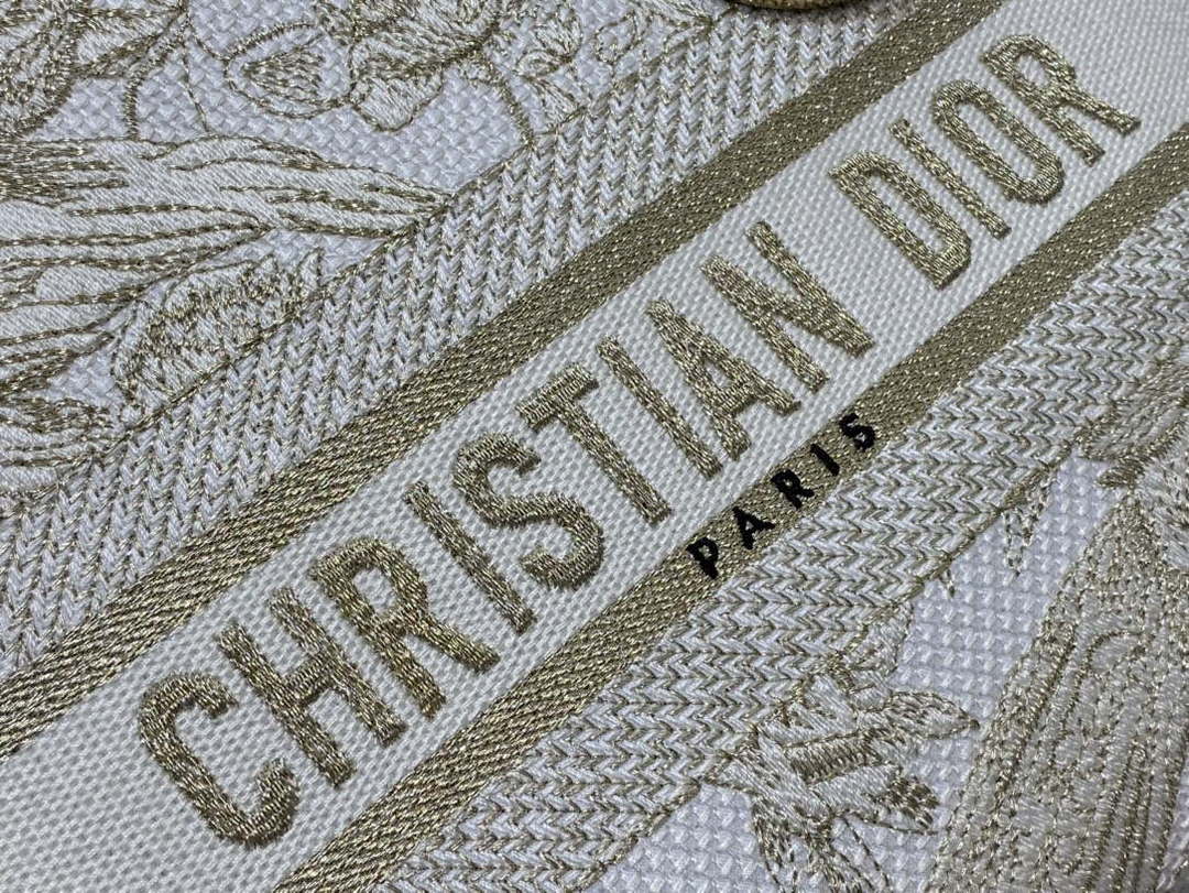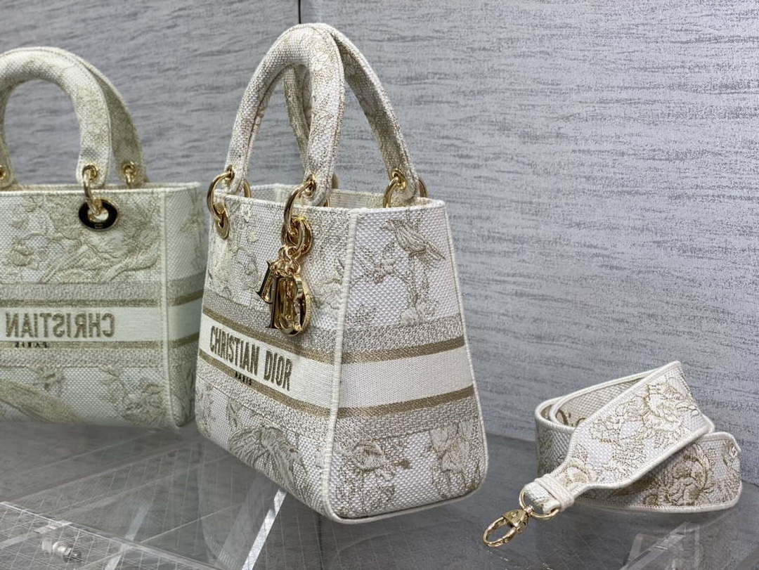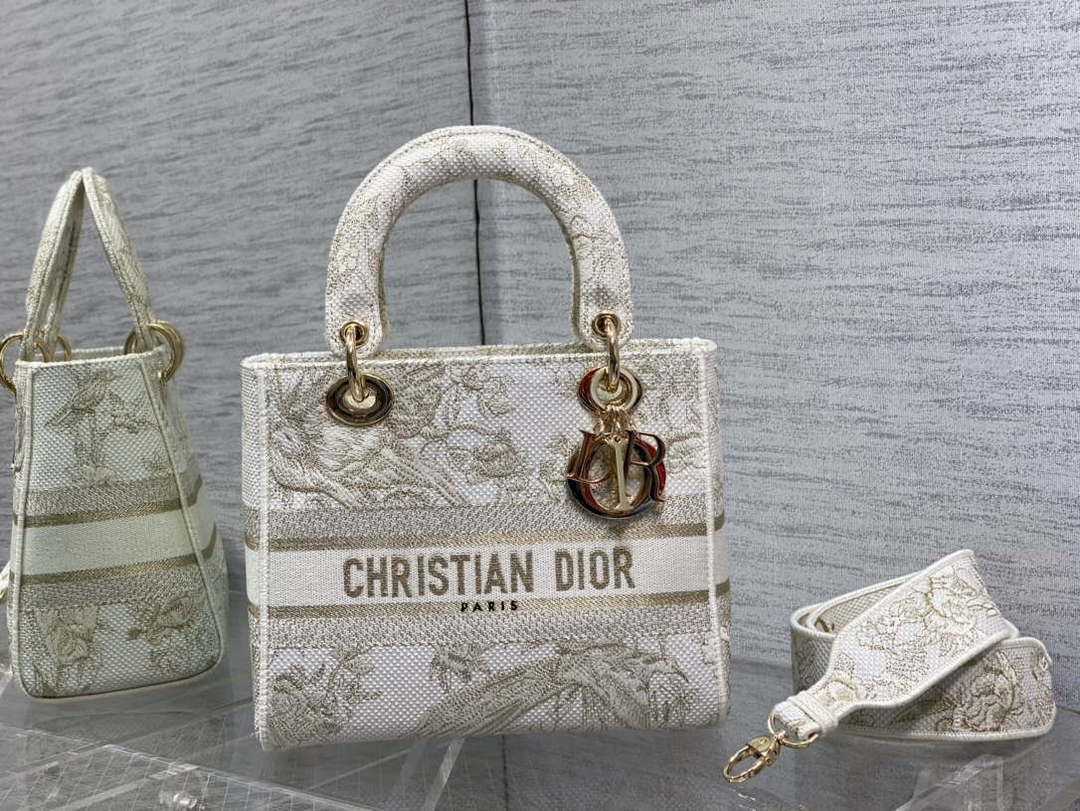 The Lady D-Lite bag combines classic elegance with House modernity. The style is fully embroidered with a beige and black Mizza motif, inspired by a leopard pattern from the House archives. The front features a Christian D1or Paris signature while the thick D.I.O.R. charms in pale gold-finish metal further enhance the silhouette. Equipped with a wide, reversible and removable embroidered shoulder strap, the medium Lady D-Lite bag can be carried by hand or worn crossbody.