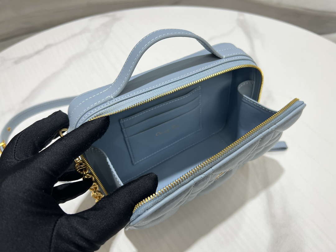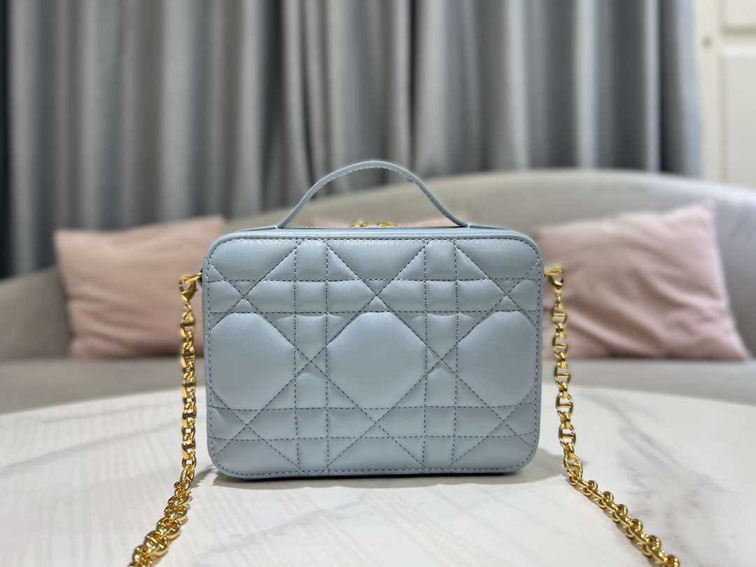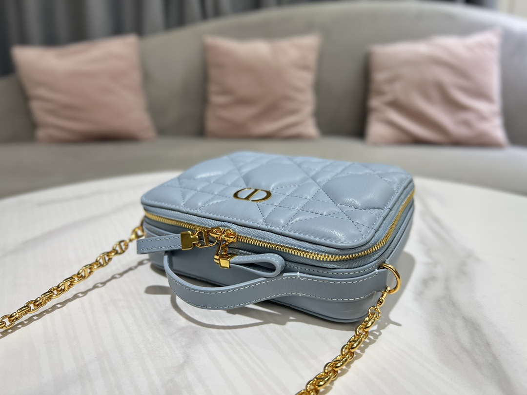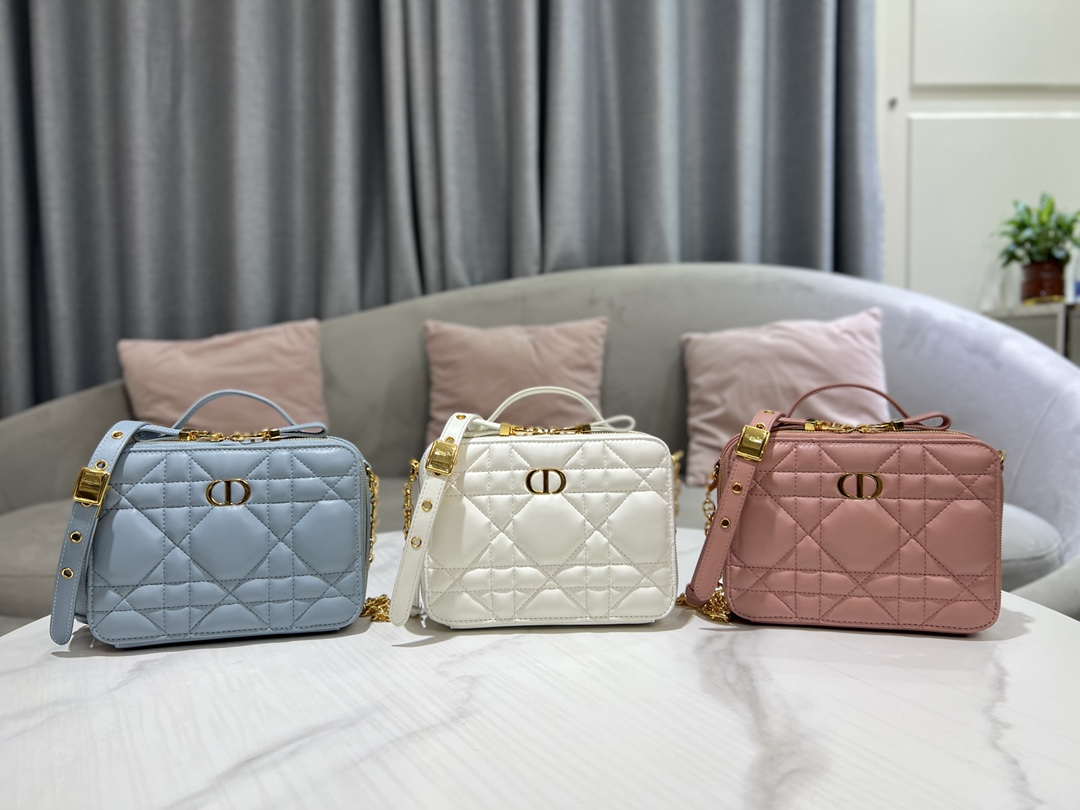Maria Grazia Chiuri’s D1or Caro box bag is a modern creation. Crafted in black calfskin, it stands out with a unique Macrocannage quilted effect and a spacious compartment, including three card slots, to accommodate all the daily essentials. The removable chain strap features a leather insert for comfortable and adjustable wear, either over the shoulder or crossbody, while the handle allows it to be carried by hand.