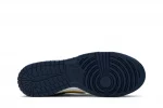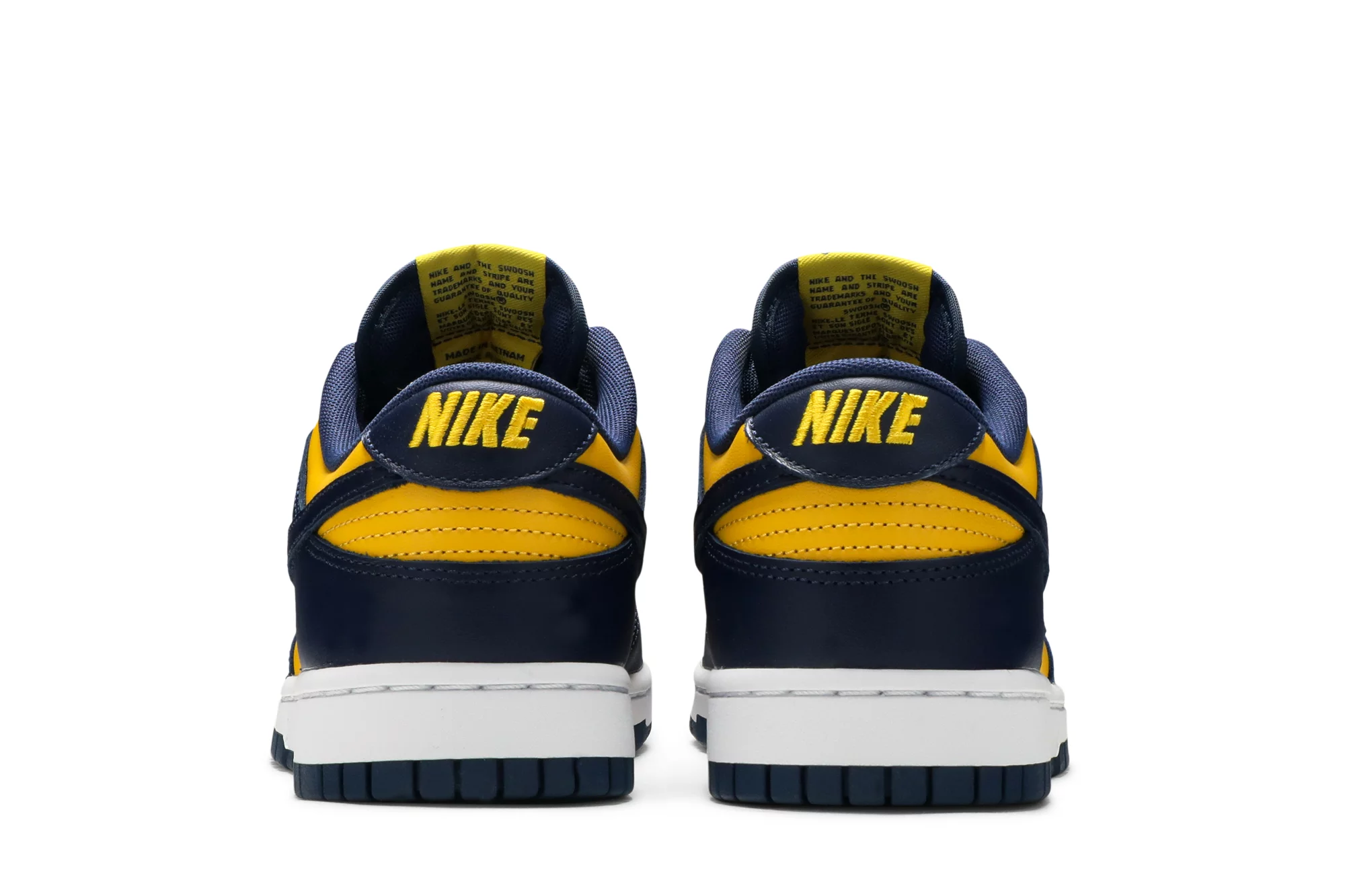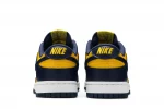 The upper of the Nike Dunk Low Michigan is made of Varsity Maize leather with Midnight Navy overlays and Swoosh logos. A woven Nike label stitched to the tongue and “NIKE” text embroidered on the heel complete the design.