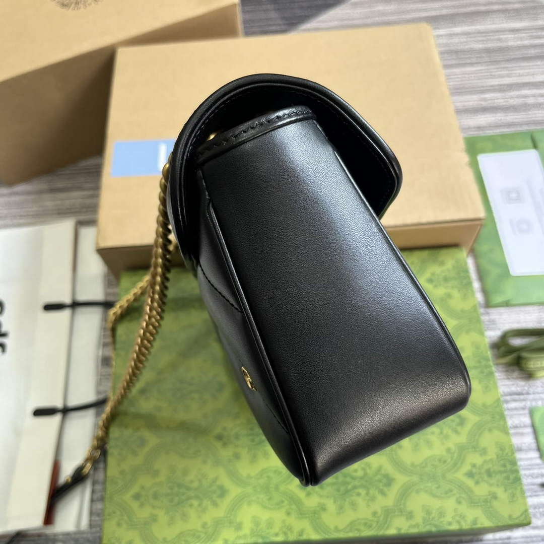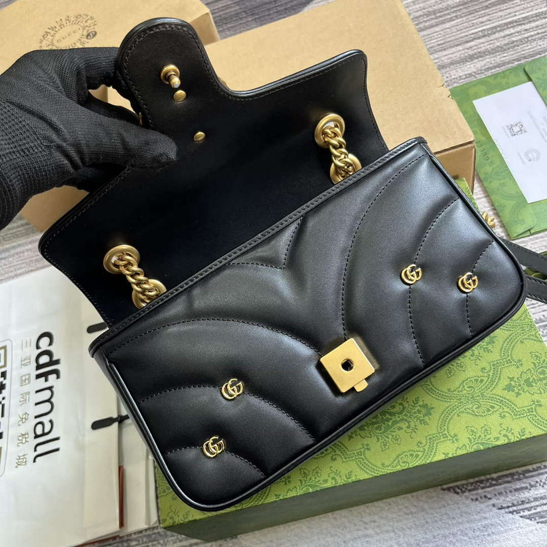 The GG Marmont shoulder bag presents a softly padded version of the black GG Matelassé leather with small Double G studs, and a twisted torchon Double G embellishment. The sliding chain strap smoothly transforms from a single shoulder length to a doubled top handle length for multiple ways to wear the bag.