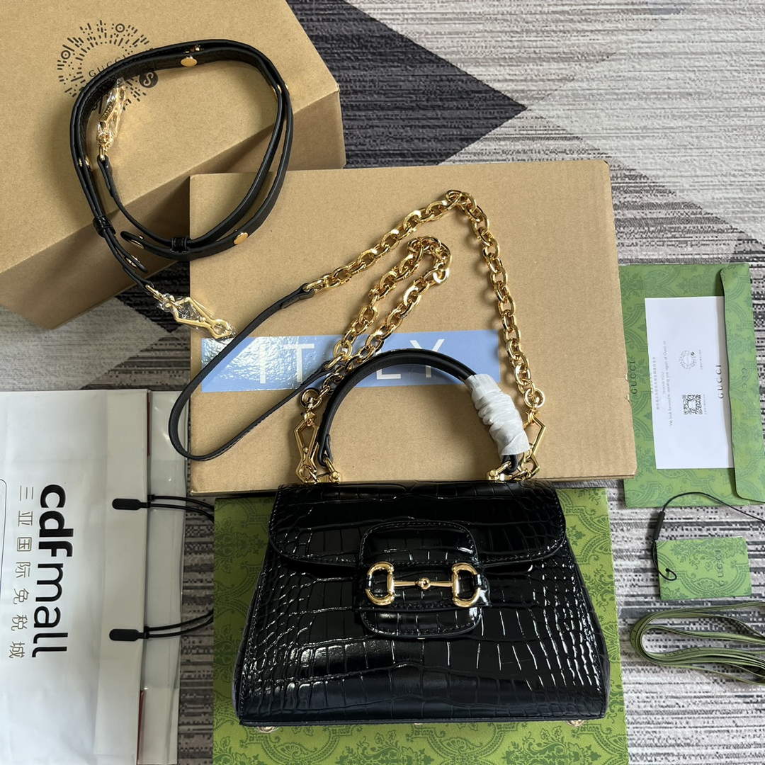The GG Horsebit 1955 is presented as a top handle bag in black crocodile leather. The collection unifies details first introduced on the original bag that inspired the line from over six decades ago with a modern spirit, highlighting the Horsebit. Part of GG’s genetic code, the double ring and bar design has been established as one of the most distinctive elements among the House symbols borrowed from the equestrian world.
