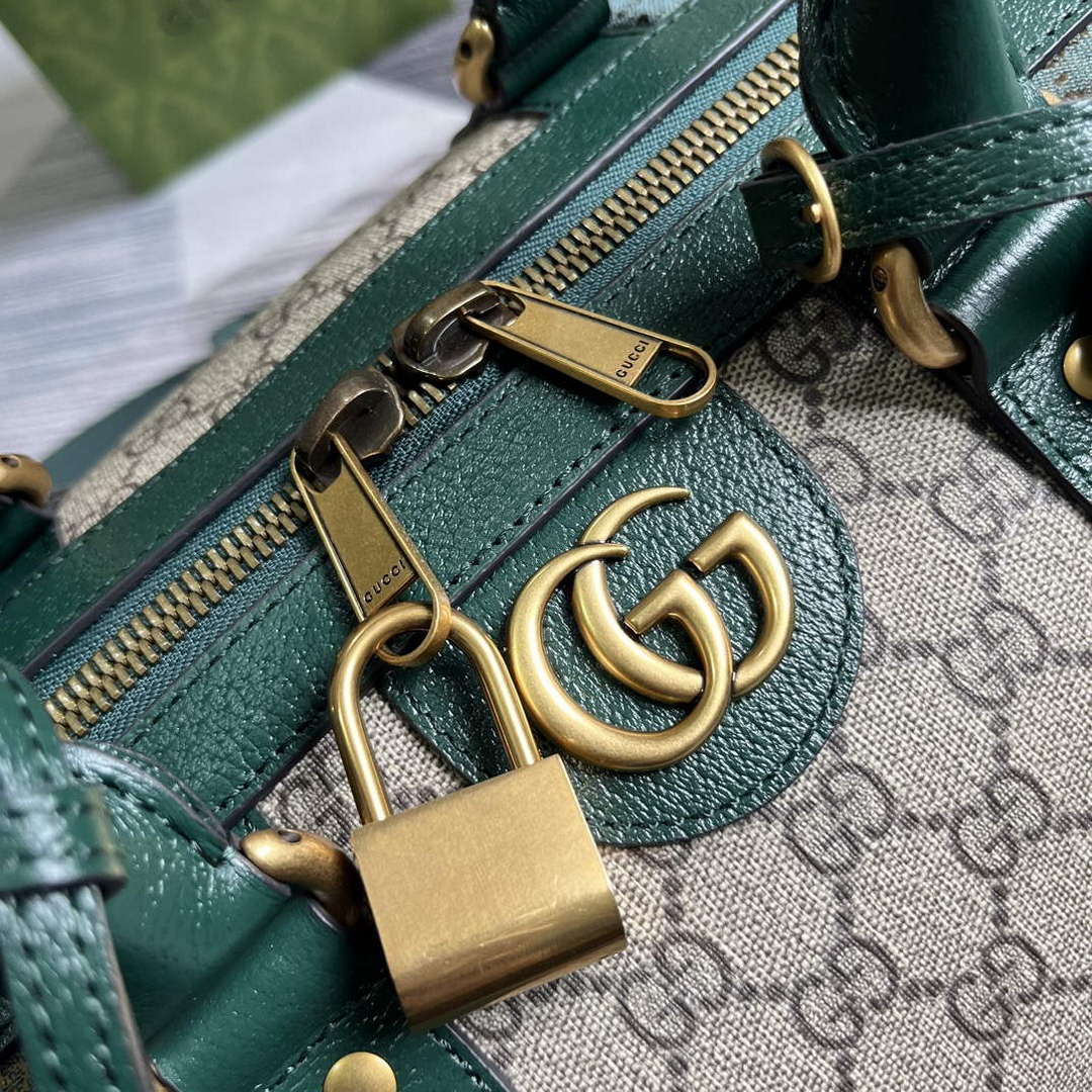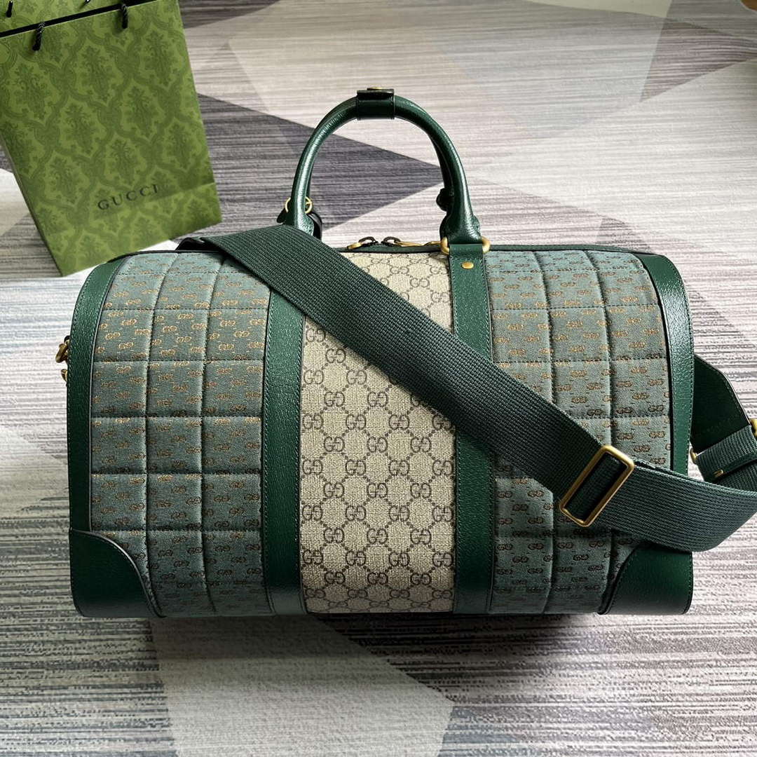 GG’s travel accessories push the boundaries of design, constantly reimagining signature travel pieces in unique ways. This duffle bag blends the historic GG Supreme canvas with a green quilted mini GG canvas, resulting in a modern accessory with vintage appeal.