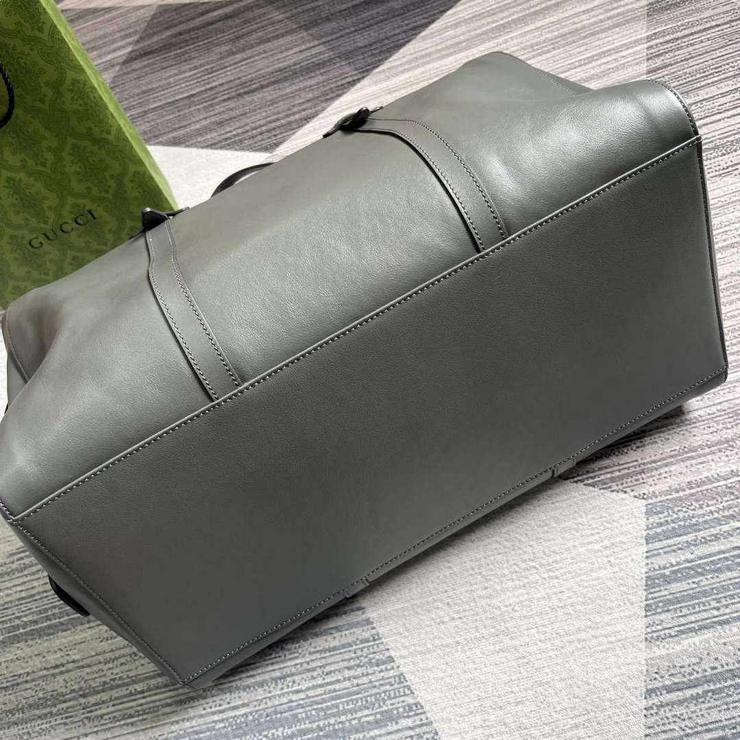 Having appeared in previous collections atop small leather goods, tone-on-tone hardware now enriches the luggage line. The enamel detail offers a softer expression of the emblematic Double G, resulting in an understated travel accessory. Here it defines a black large leather tote bag with an elegant logo feel.