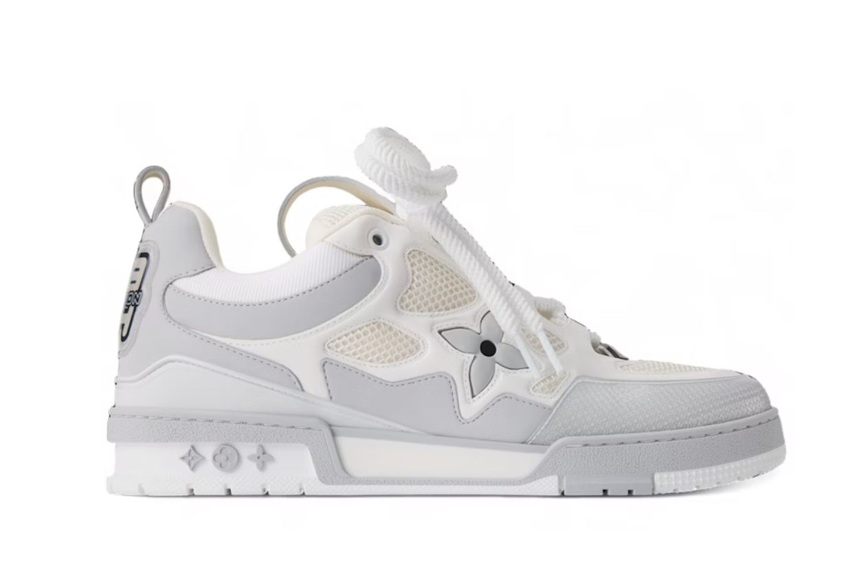 Crafted from smooth calf leather and suede overlays, the light grey colorway offers a versatile and minimalist aesthetic, making it perfect for both casual and elevated looks. The padded tongue and cushioned midsole deliver all-day comfort, while the oversized LV branding on the side and subtle monogram accents highlight the signature LV touch.