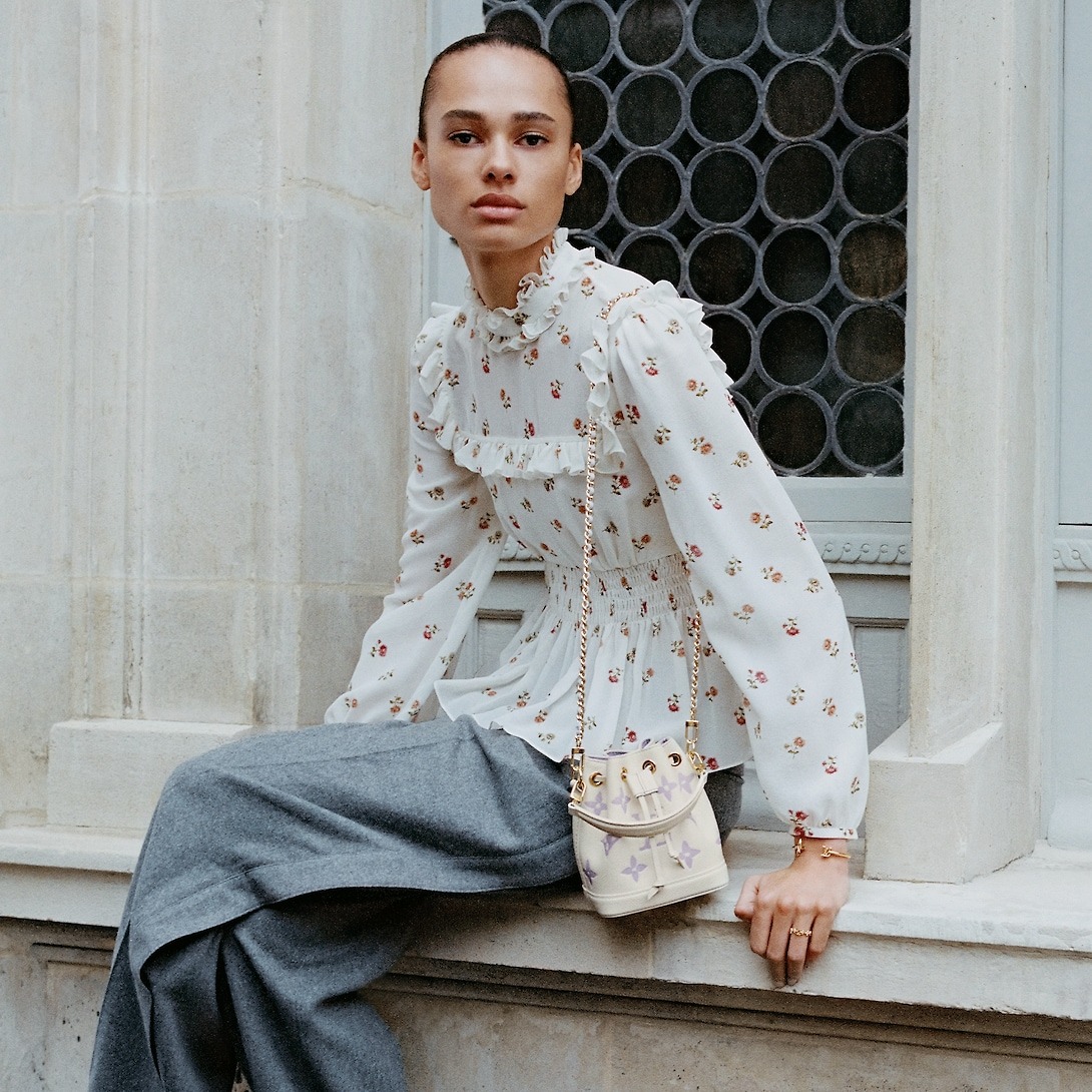 Notable for its drawstring closure, this miniature replica of the iconic Noé bag offers several carry options thanks to its removable handle and removable, gold-tone chain, which is interlaced with leather.
