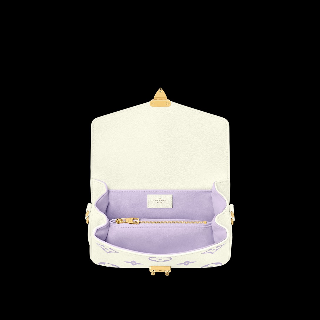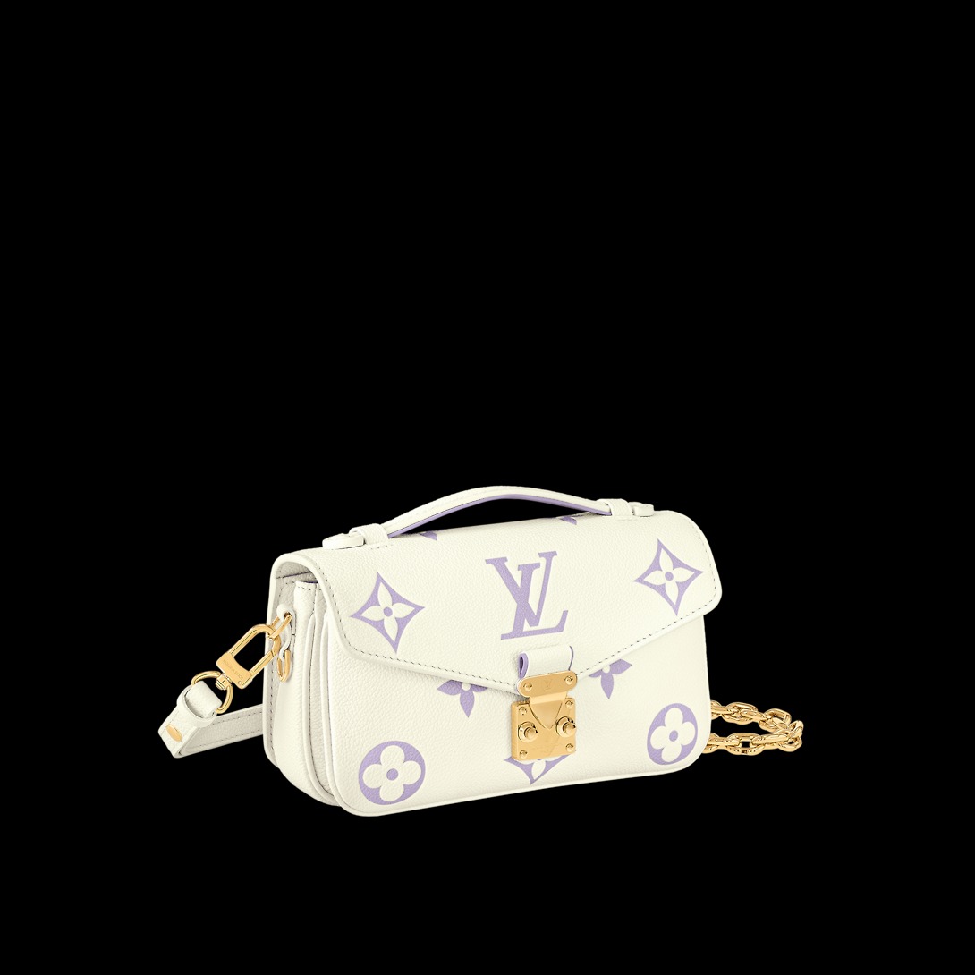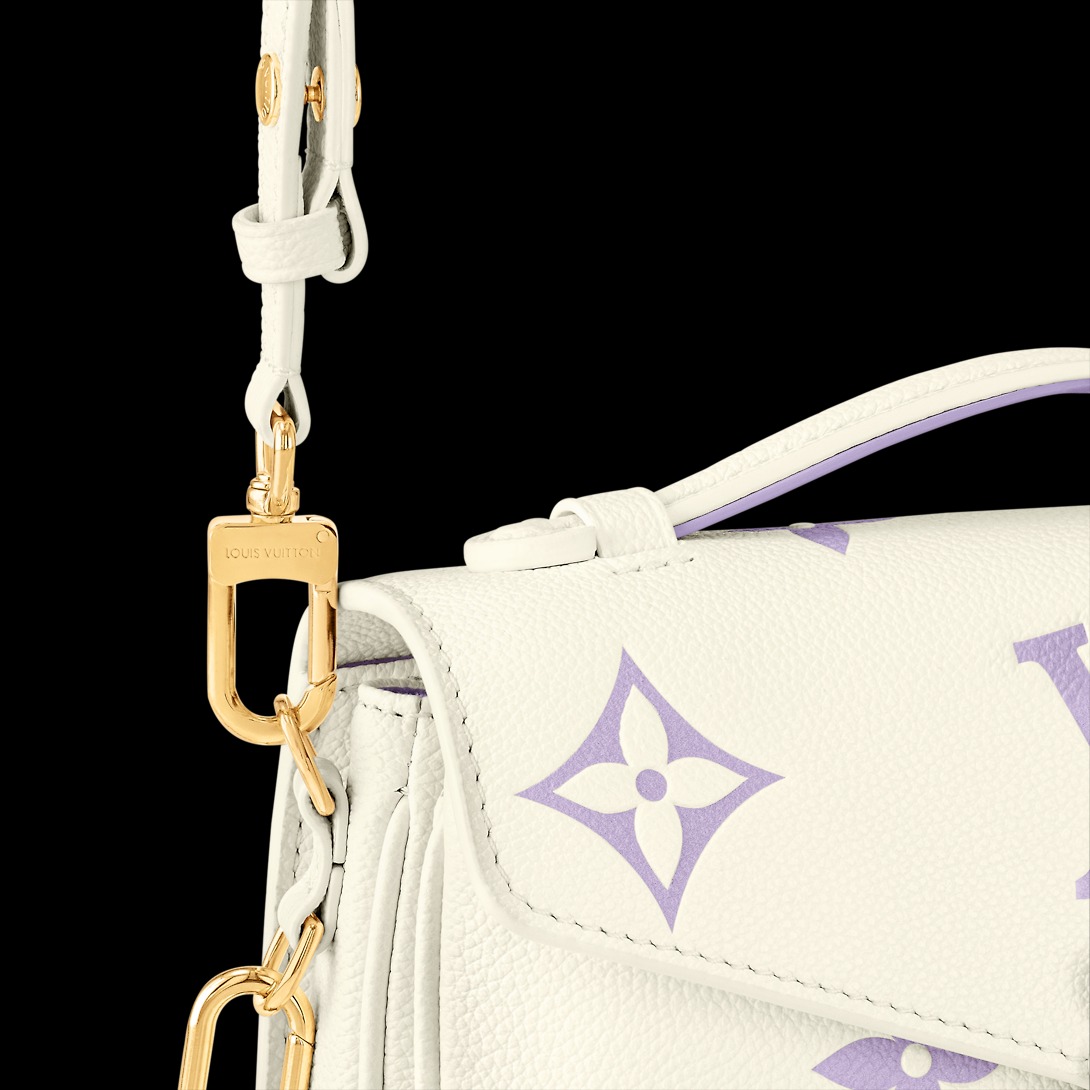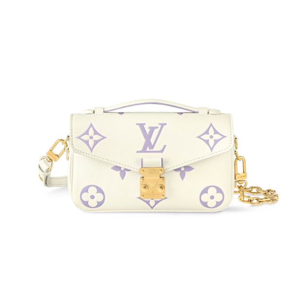 This Pochette Métis East West handbag features a luminous off-white base with the Monogram motif embossed and then printed on the leather in a muted pastel tone. The Pochette Métis has a leather handle, a removable chain, and a detachable strap for carry options.