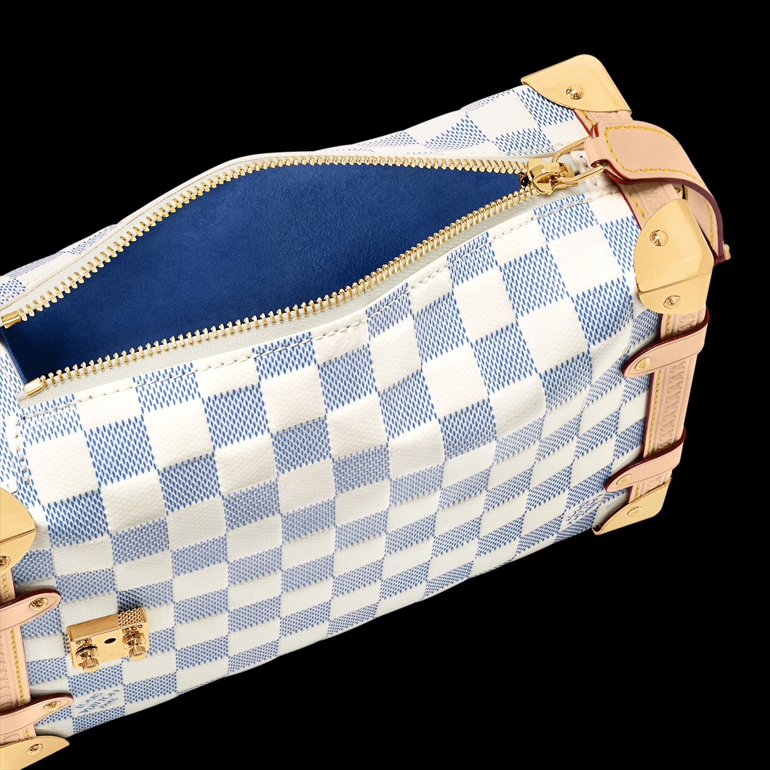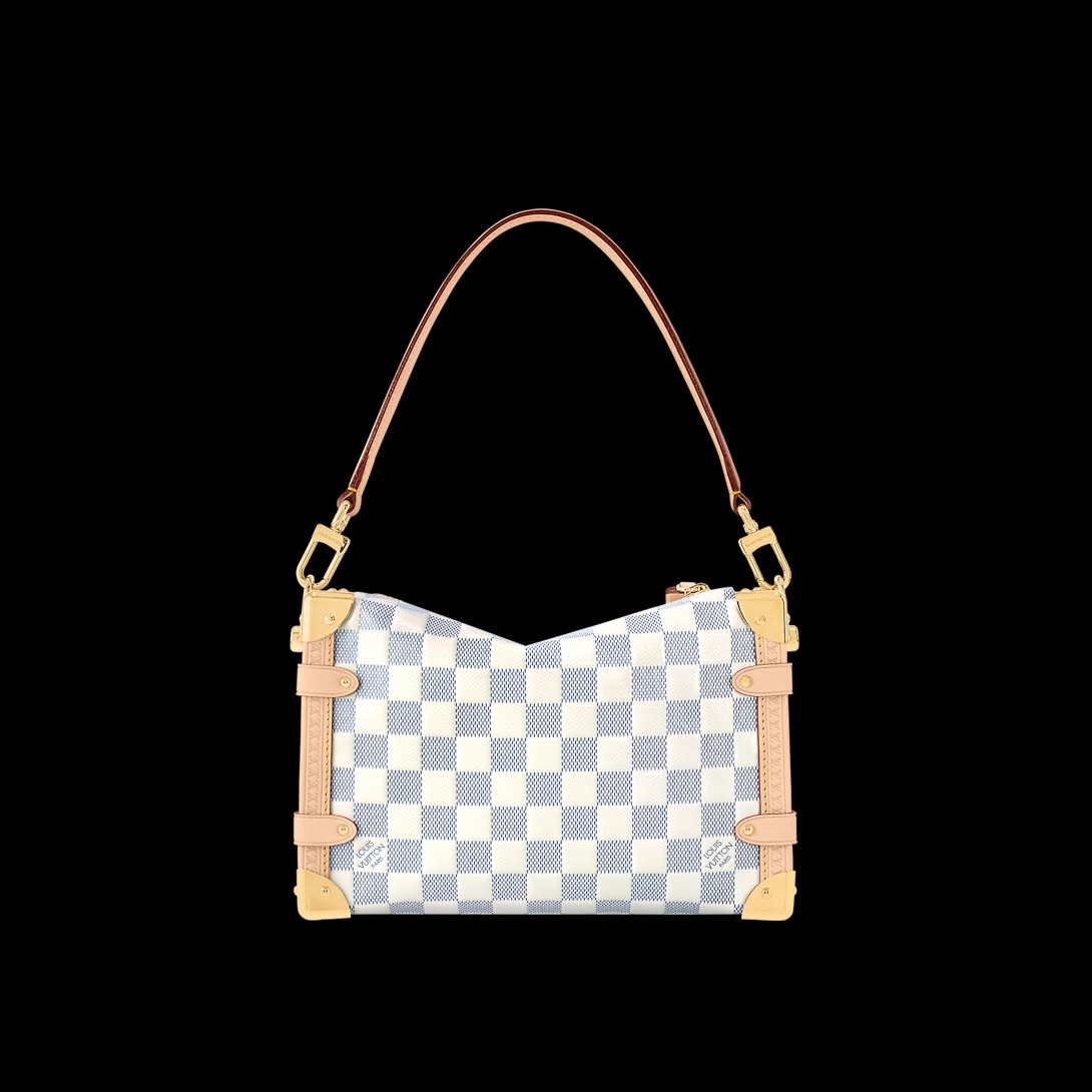 Creative Director Nicolas Ghesquière’s playful Side Trunk MM is reimagined in Damier Vernis. The S-lock and other hardware are a golden hue. It features a removable handle and an adjustable and removable shoulder strap.