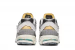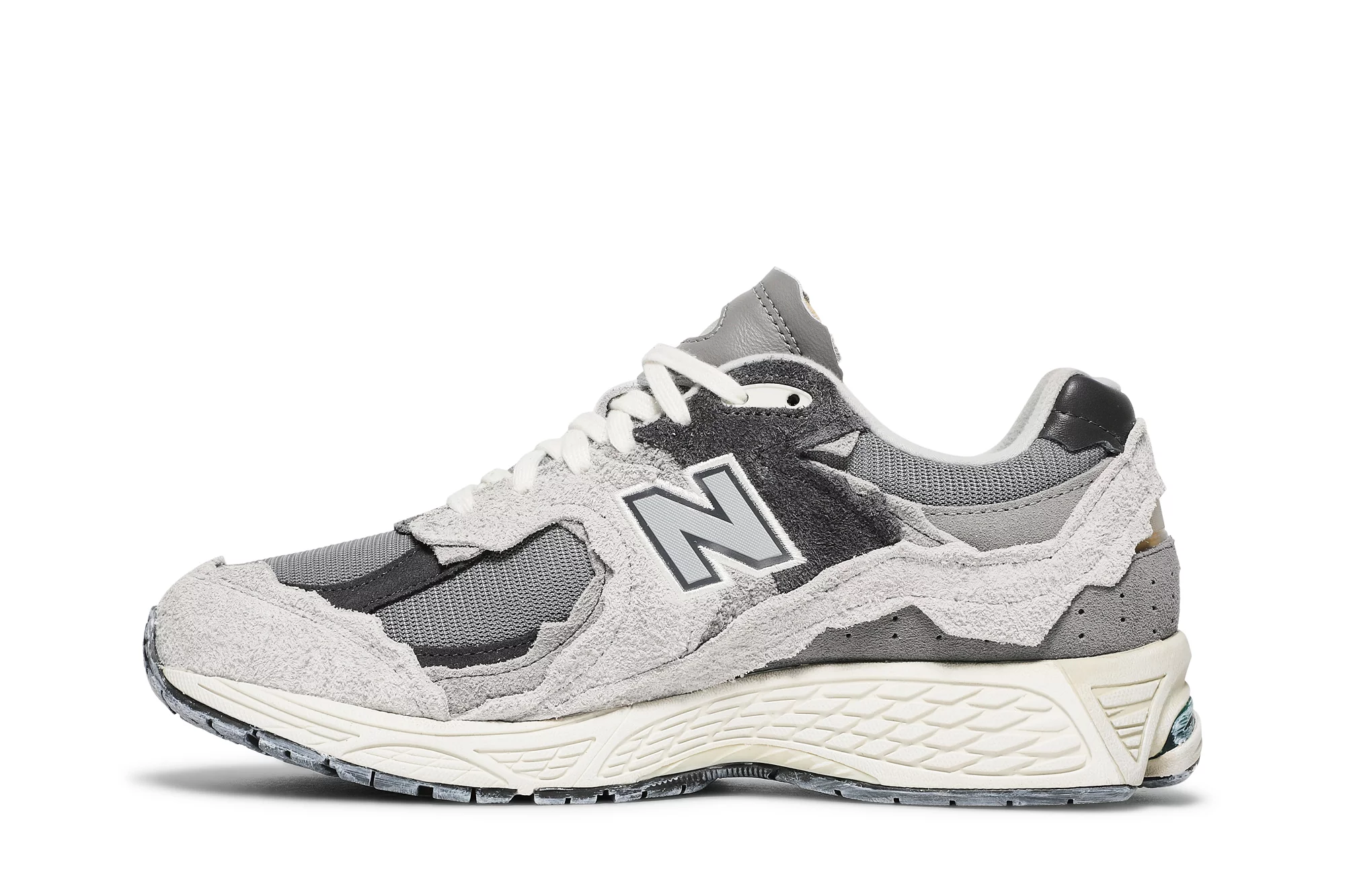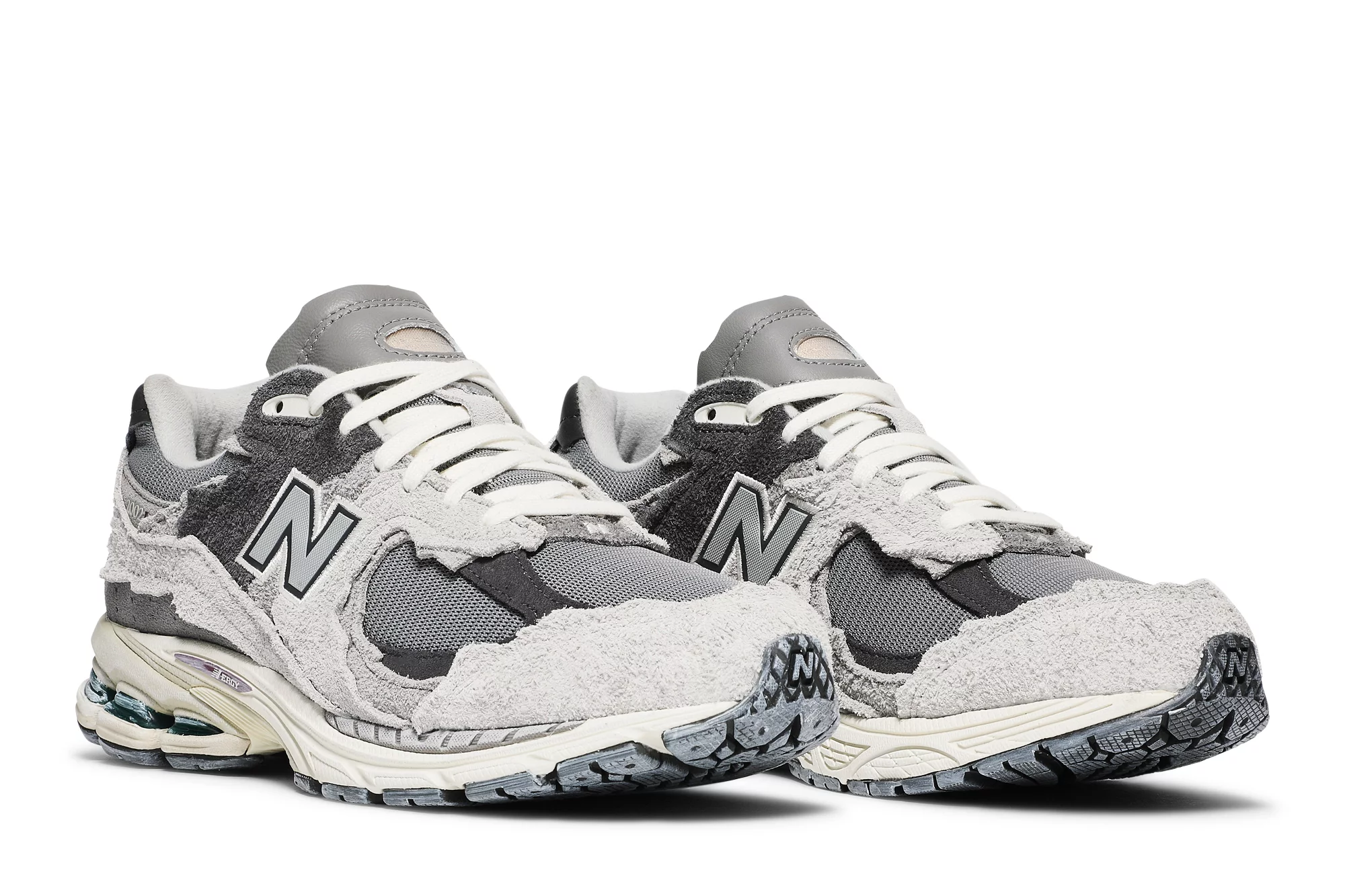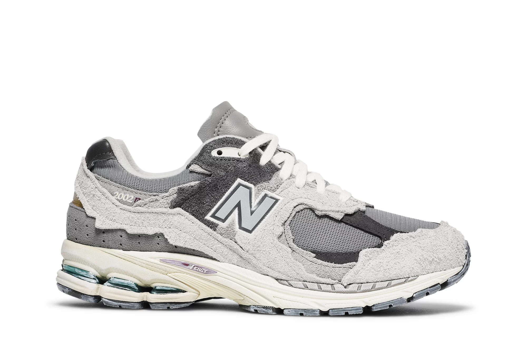 The New Balance 2002R Protection Pack Rain Cloud features a grey mesh upper with tonal jagged suede overlays and a reflective New Balance logo. From there, a cream Nrgy midsole and grey outsole complete the design.