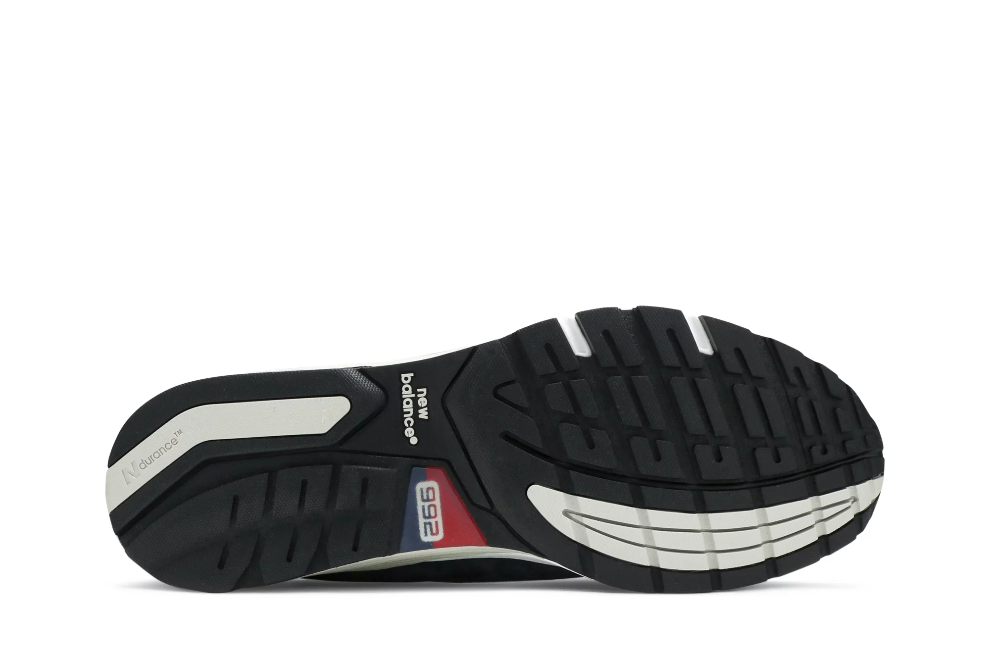 The New Balance 992 Navy Grey features a navy blue mesh upper with the white laces and black overlays that wrap around the shoe. A white ENCAP sole completes the design.