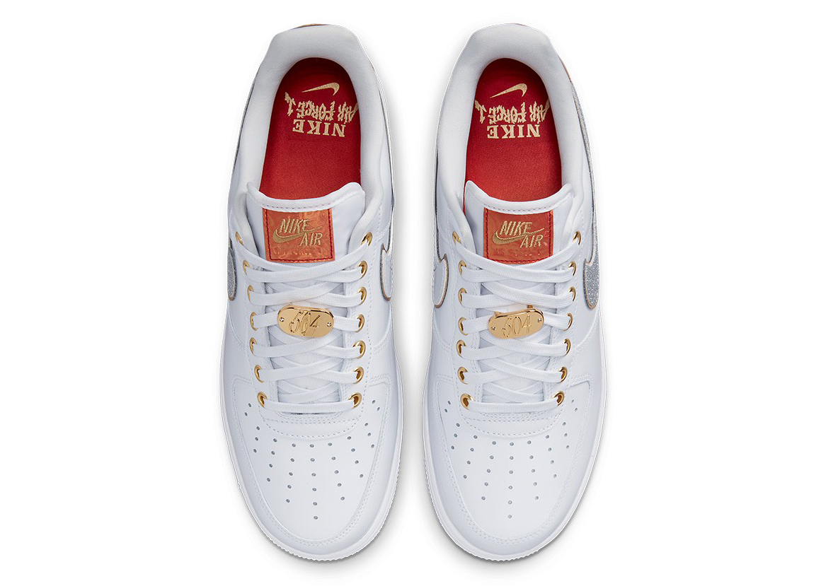 The Nike Air Force 1 Low NOLA, inspired by the city of New Orleans, comes in a white, silver, bronze, and red colorway.