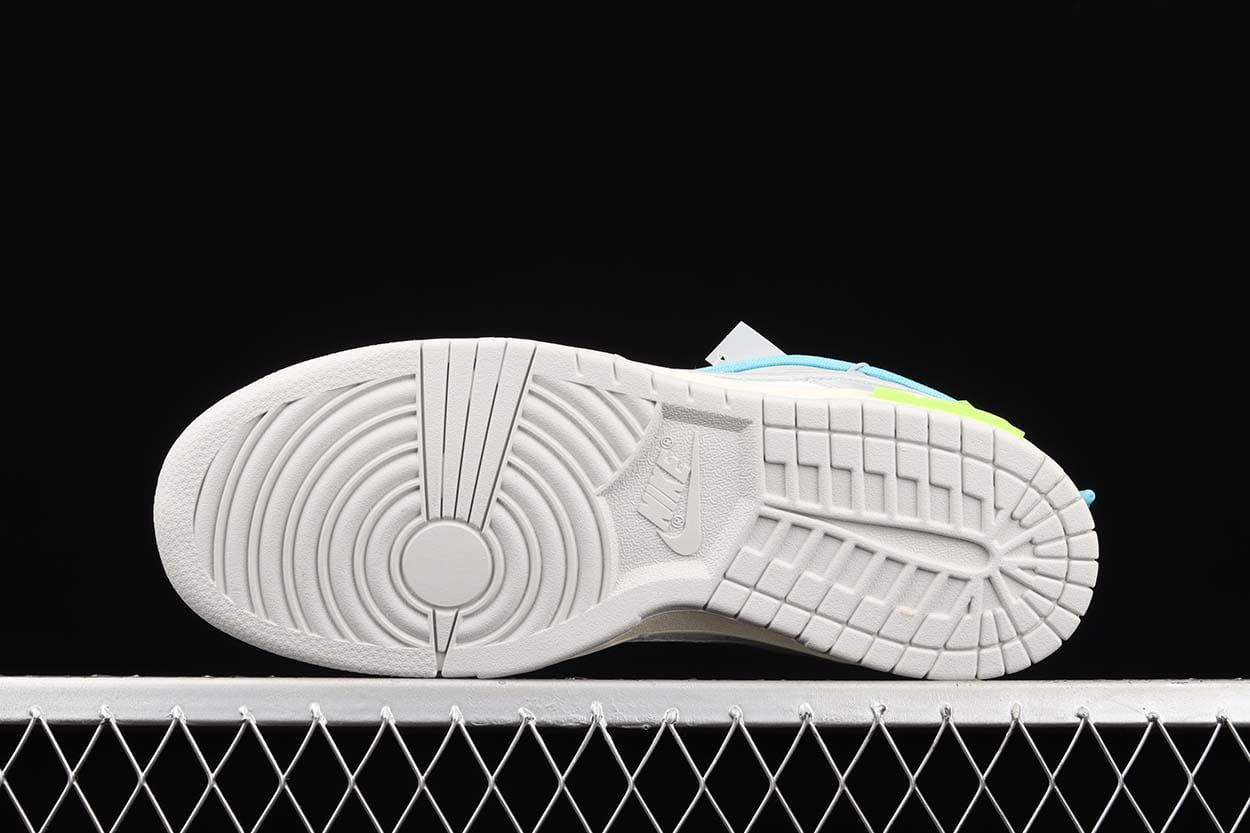 The Nike Dunk Low Off-White Lot 2 comes in a sail, neutral grey-blue fury color scheme.