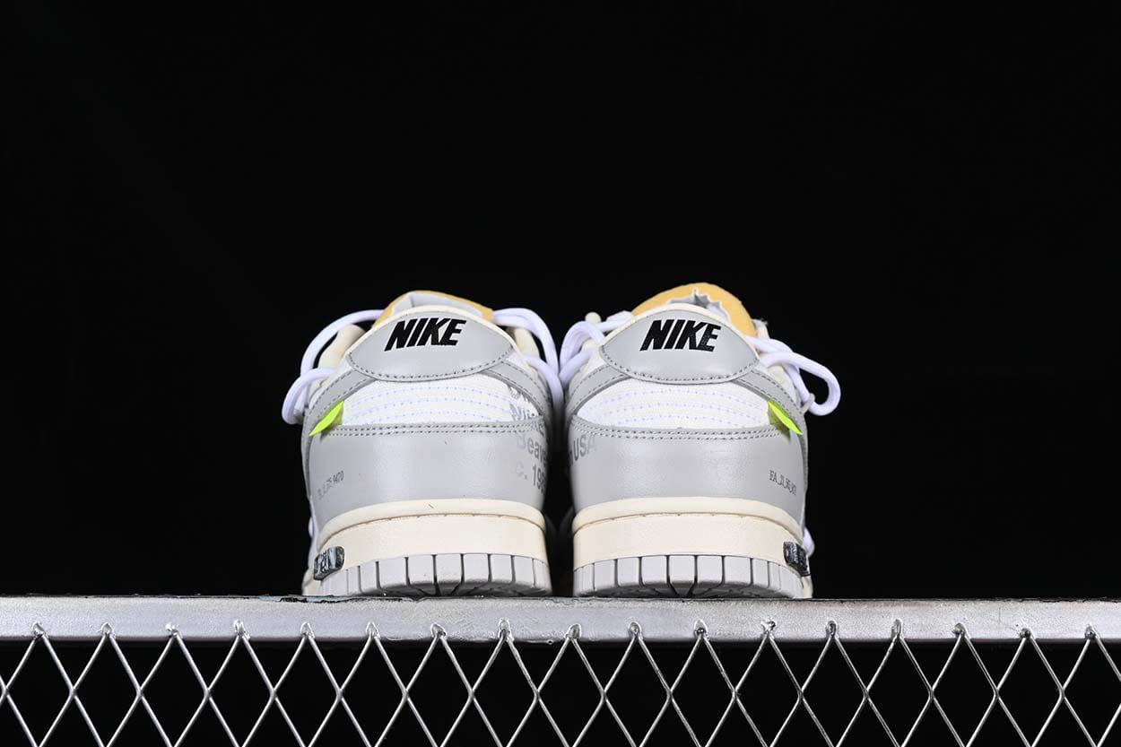 The low top of the Nike Dunk Low Off-White Lot 49 utilizes a white leather upper with canvas overlays in soft gray. The silhouette signature features a Swoosh with an affixed rectangular tab and an exposed-foam tongue. A secondary lacing system with a contrasting pop of color can be found as part of its design. Also, a “49 of 50” badge is attached to the lateral midsole. This sneaker includes special accessories: grey OW ziptie and yellow “Off-White” paper.