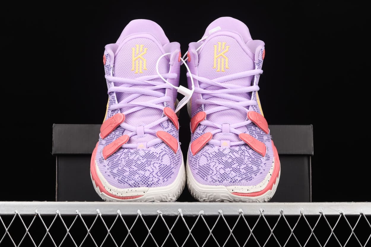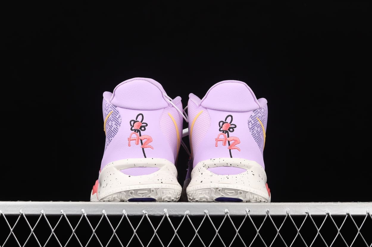 The Nike Kyrie 7 Daughters Azurie features a lavender upper made of breathable mesh. It also features a tonal floral print throughout its textile underlay. An embossed floral graphic decorates a quartet of coral-colored TPU fins that are integrated into the laces for a lockdown fit. “AZ” is embroidered on the heel overlay as a nod to Kyrie Irving’s daughter, Azure Elizabeth. The shoe has a lightly speckled Phylon midsole with an AirZoom Turbo unit in the forefoot.