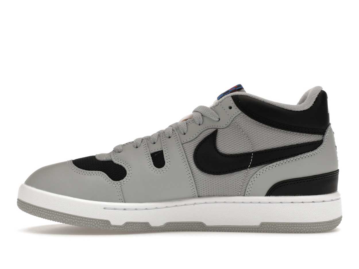 The Nike Mac Attack QS SP Travis Scott Cactus Jack is unveiled in an engaging Light Smoke Grey, Black, and White color combination, incorporating a mix of leather and mesh across its upper. The mesh is prominently featured on the vamp and side panels, while high-quality leather forms the majority of the shoe’s construction.