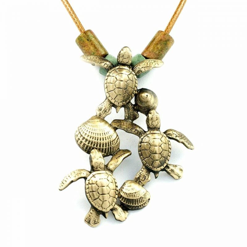 This “Ocean in Motion” sculpture pendant depicts newly hatched sea turtles racing among shells toward the safety of the sea. Clear lacquer is added to prevent tarnishing. The pendant is surrounded by colored ceramic accent beads from Greece.
