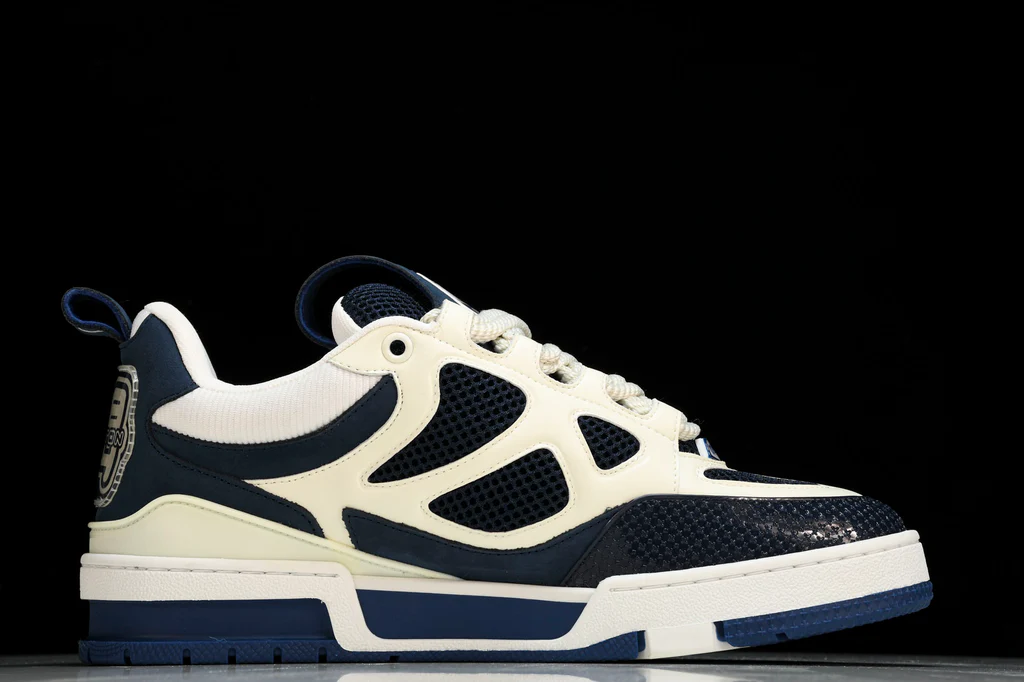 Designed by Virgil Abloh, the 𝓛𝓥 Skate Sneaker ‘Marine White’ is a sophisticated blend of 90s-inspired skater aesthetics, making its debut at the Fall-Winter 2022 men’s show. The sneaker boasts an intricate dark blue and white panelled upper adorned with elegant M0nogram Flower detailing, masterfully crafted from technical mesh, calf leather, and suede. It stands out with a comfortable padded collar, exaggerated double laces, and a striking bicolor rubber outsole embellished with M0nogram Flowers, exemplifying the brand’s commitment to both style and innovation.