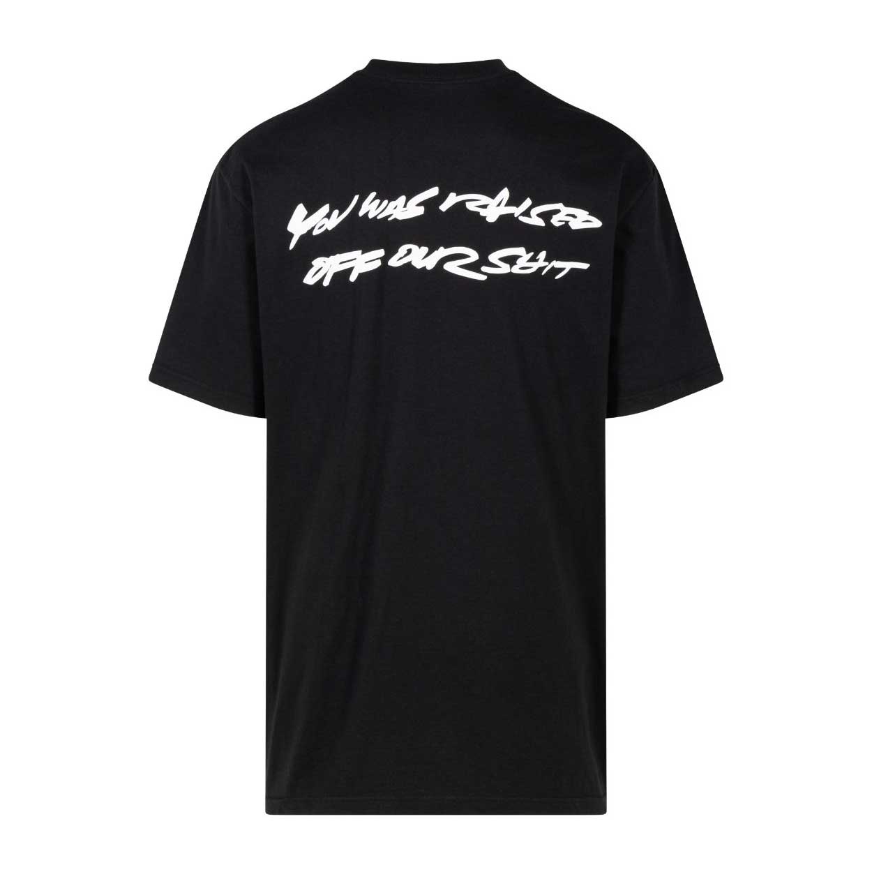 The Supreme Futura Box Logo Tee Black is a black t-shirt fabricated from 100% cotton, featuring the Supreme logo in white text within a black box on the front. The reverse of the tee is emblazoned with white text that reads “You Was Raised Off Our Sh*t.”