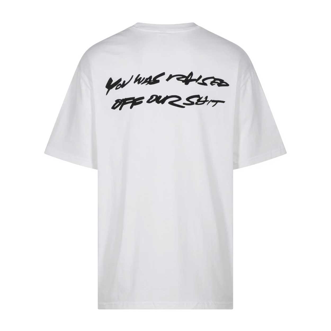The Supreme Futura Box Logo Tee White is a white 100% cotton t-shirt that features the Supreme logo in white text on a black box on the front. The tee’s reverse features the message “You Was Raised Off Our Sh*t” in black text.