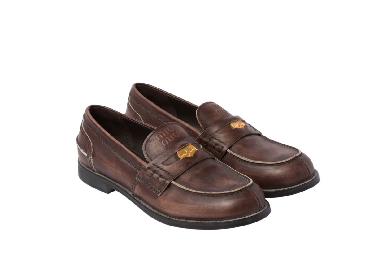 In the ’50s, loafers were part of school uniforms worn by U.S. prep school and college students. Annoyed by having to wear a uniform, students started inserting a shiny penny in the slot of the leather band, giving rise to the name “Penny Loafers”. Miu Miu gives this timeless footwear synonymous with tradition an update in a vintage version.