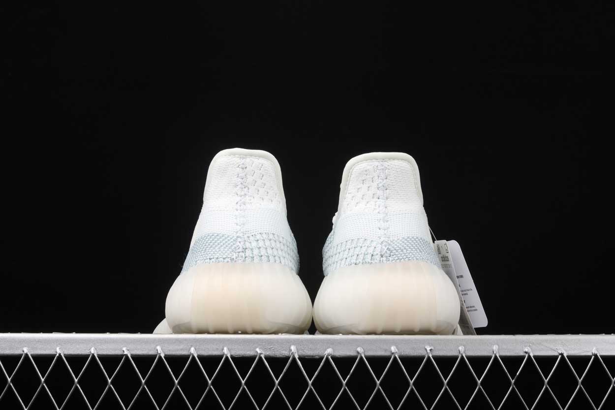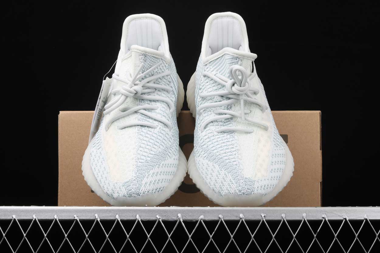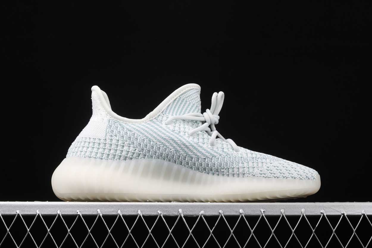 The adidas Yeezy Boost 350 V2 Cloud White (Non-Reflective) combines shades of cream and bluish-white to recreate the hue of a fluffy cloud. A hard sole offers a contrast to the elastic shoelaces and knitted fabric upper. Instead of separate overlays, the upper has the appearance of a single stitched-together piece. One side of the sneaker offers a transparent strip, and the other highlights the blue-and-white patterns. The adidas Yeezy Boost 350 V2 Cloud White (Non-Reflective) uses Primeknit to create a woven textile appearance.