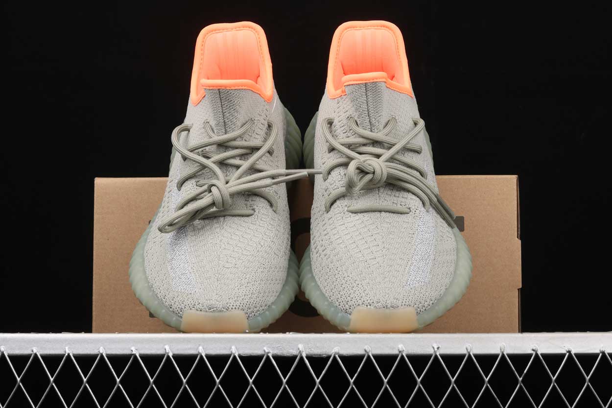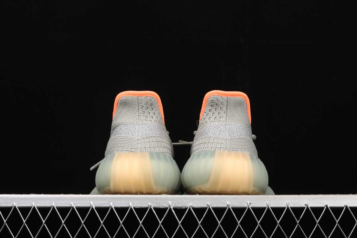 This Yeezy 350 V2 is composed of a desert sage Primeknit upper with a tonal side stripe. A translucent Boost cushioned sole and orange interior completes the design. These sneakers released in March of 2020