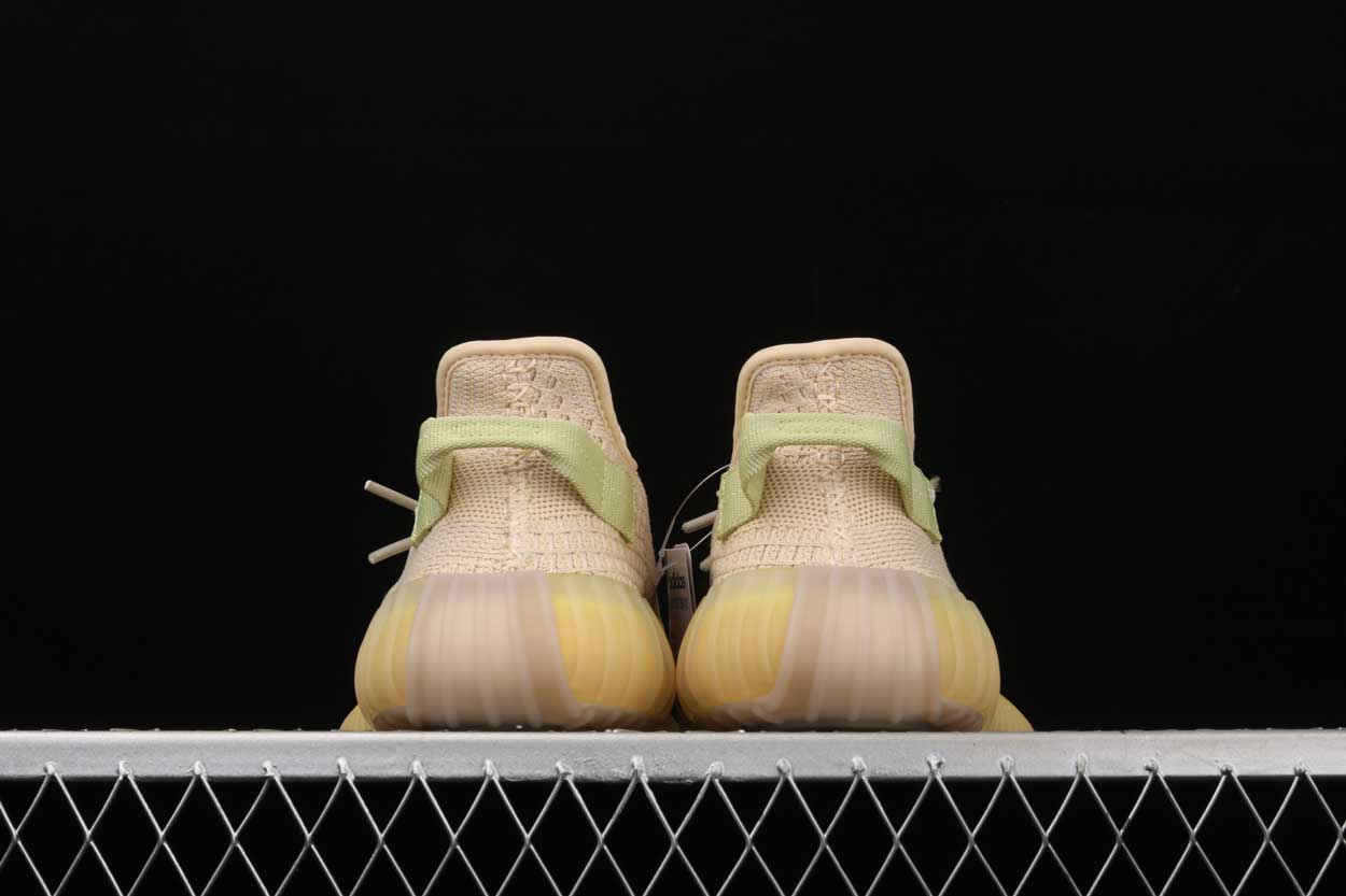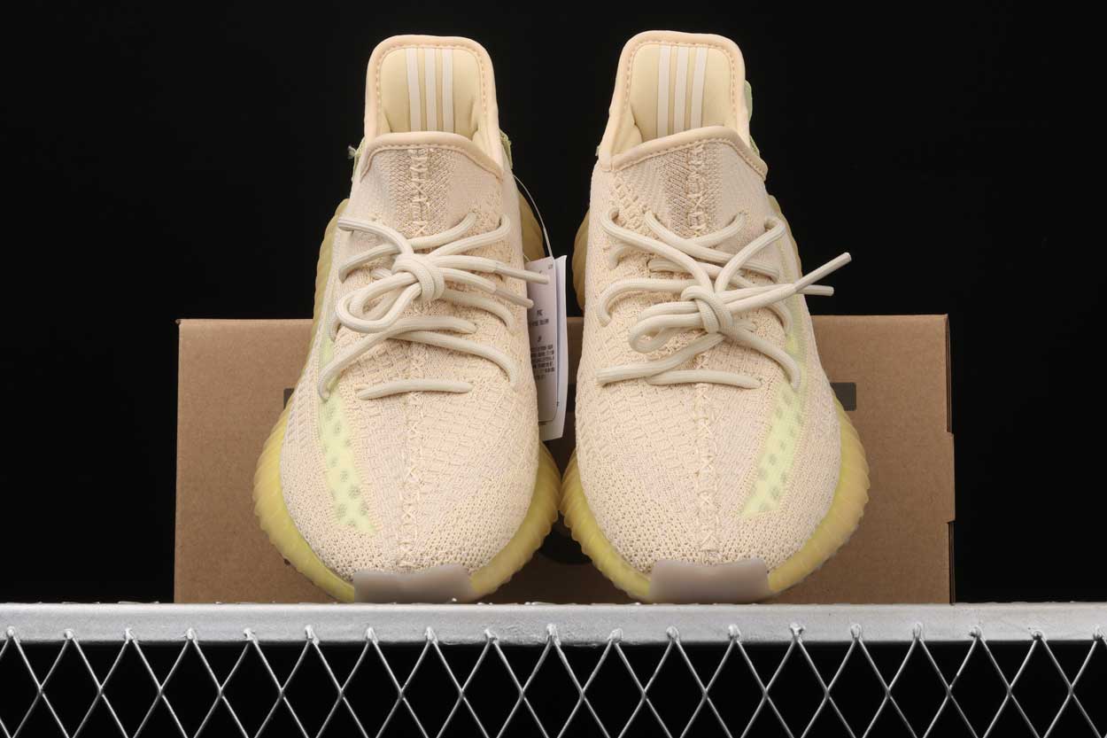 This Yeezy 350 V2 Flax is composed of a light brown Primeknit upper with a translucent outer side stripe. A translucent Boost cushioned sole and light brown interior completes the design. These sneakers released in February of 2020.