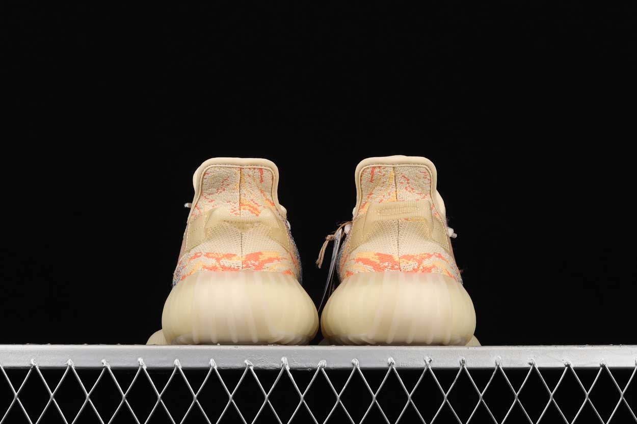 The adidas Yeezy Boost 350 V2 MX Oat features a yellow, orange, and blue swirl-patterned Primeknit upper with a mesh side stripe and yellow heel tab. From there, a semi-translucent Boost midsole and pale yellow rope laces complete the design.